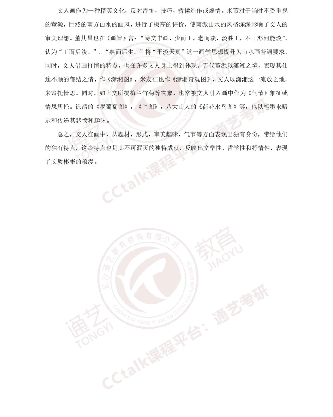 用。米芾曾言:“子瞻作枯木,枝干虬屈无端,怪怪奇奇,盖是描写胸中磊落不平之气,以玩世者也。”之后,宋元之际的郑思肖以“无根之兰”为题材,表达故国痛楚,倪瓒以墨竹聊写胸中逸气,吴镇作《渔父图》,王蒙的《青卞隐居图》等,都表现出文人的生活关注。这种新的题材,高的文化修养,也影响了其对画面的处理。“墨”不仅可以称为“文人画”的代表,甚至可以说是中国画的代表。这与文人在绘画时,重水墨,重写意的特点分不开,王维用远近浓淡对比凸显层次,为后续写意水墨风格打开了一扇窗。之后在花鸟上,徐熙以“落墨”神气迥出,米芾,米友仁以“墨戏”画云烟变灭,发展了董源水墨渲染的效果,以点代皴。同时,诗书画三者结合的方式,使文人画在技法上更上了一层台阶。苏轼在观被称为文人画之祖的王维所画《蓝田烟雨图》后,题跋“味摩诘之诗,诗中有画;观摩诘之画,画中有诗。”代表了“以诗入画”的开端。宋代苏轼也以诗书画结合进行实践创作。“以书入画”在张彦远《历代名画记》中便以理论的方式,指出了书与画的关系。赵孟頫以“石如飞白木如籀,写竹还应八法通,若也有人能会此,须知书画本来同”的思想,对书画结合进行了又一飞跃。文人运用墨干湿浓,浑厚苍润的微妙变化,不求形似,以诗入画,以书入画,计白当黑等绘画方式,其实都表现了其文人趣味。