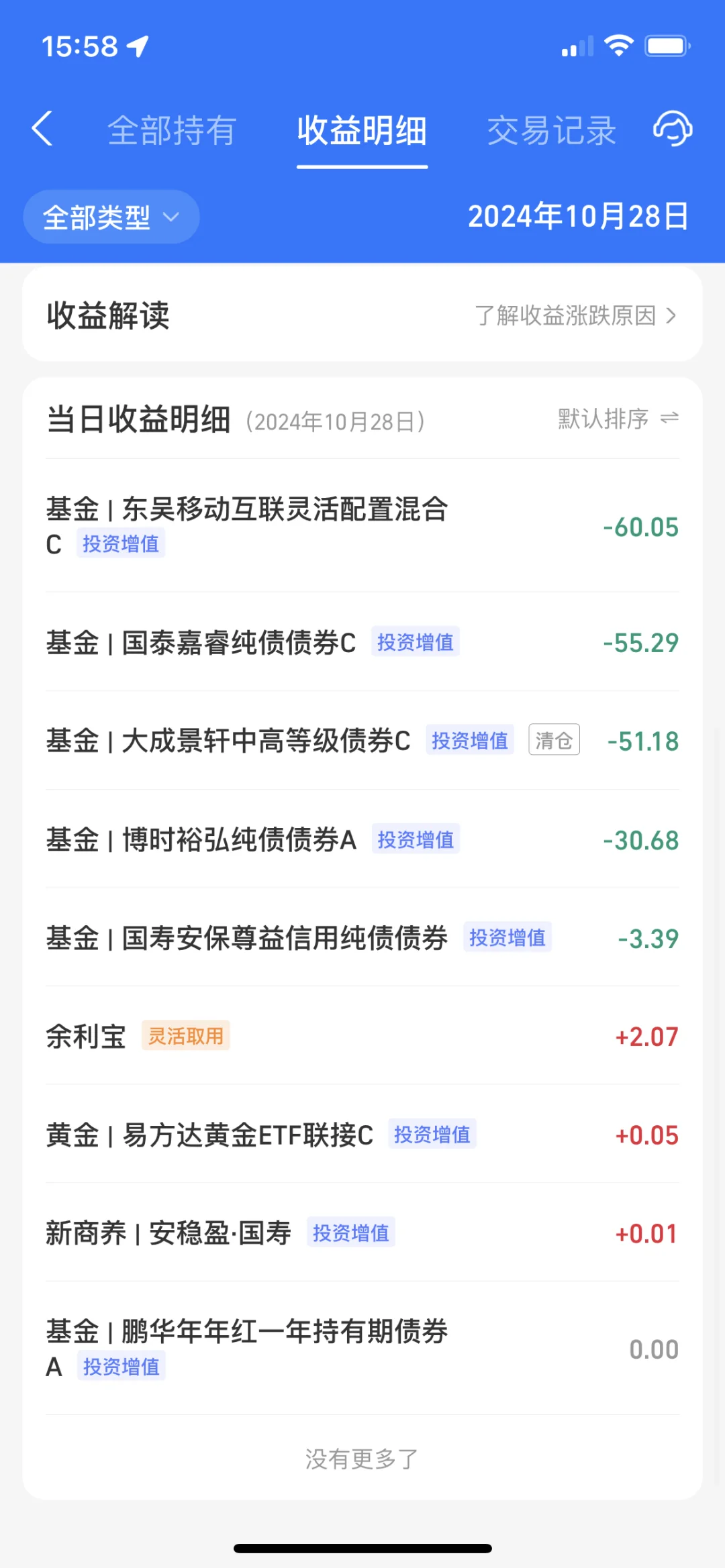 我的理财日记 哭唧唧,债券都跌了就几天咯, 不想看,不想看,大摇头, 不过,可能应该快涨了, 因为我卖了大头! 今天加了一个超级稳的债, 不求大富大贵,只求小富即安~