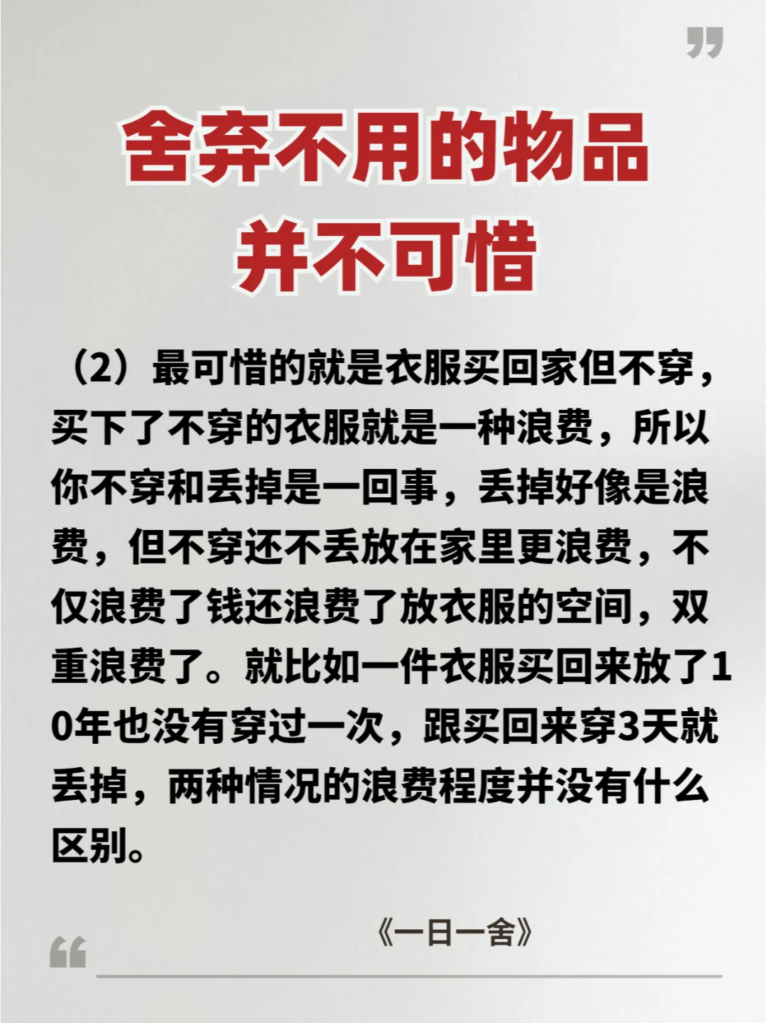 [打卡R]最可惜的就是衣服买回家但不穿,买下了不穿的衣服就是一种浪费,所以你不穿和丢掉是一回事,丢掉好像是浪费,但不穿还不丢放在家里更浪费,不仅浪费了钱还浪费了放衣服的空间,双重浪费了。就比如一件衣服买回来放了10年也没有穿过一次,跟买回来穿3天就丢掉,两种情况的浪费程度并没有什么区别。