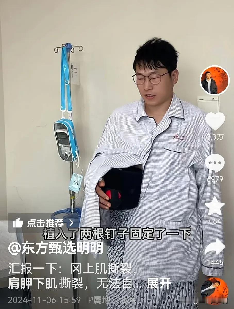 明明做了个手术,听他说了几句就觉得哎呀妈呀得多疼啊!看着他右侧手臂下的装备,据说要陪伴他56天,感觉这手术蛮大的!一看病号服的俩字儿,北三!北医三院啊!运动医学绝对的王者!