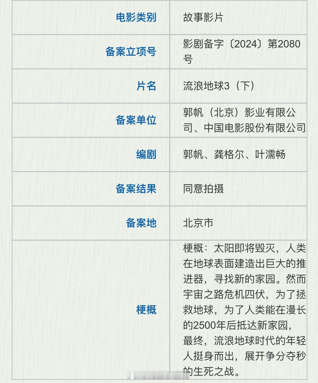 梗概:太阳即将毁灭,人类在地球表面建造出巨大的推进器,寻找新的家园。然而宇宙之路危机四伏,为了拯救地球,为了人类能在漫长的2500年后抵达新家园,最终,流浪地球时代的年轻人挺身而出,展开争分夺秒的生死之战。