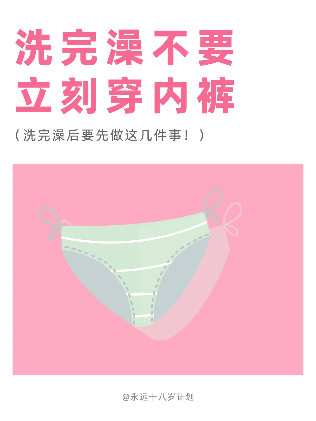 洗完澡后建议不要立刻穿小内内噢,等全部干透再穿,能减少不少妇科问题,亲测有效~快告诉姐妹们