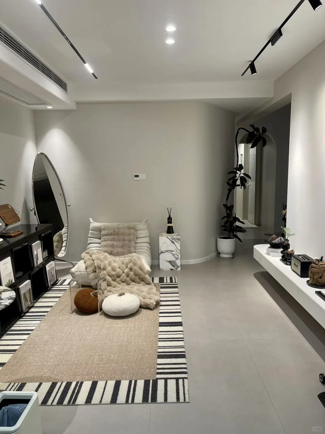 🏠小户型轻硬装更能达到简洁大方的效果 无主灯的客厅是不二选择 📍我家客厅开间长3.35米,宽3.34米 📍客厅连阳台通铺过去,阳台1.57*3.34米 📍用了两条嵌入式轨道灯、两个孔灯、两个氛围射灯 色温统一选用了4000K ⚗️开灯后整个空间也显的很通透 不想太亮的时候就开侧面氛围灯 想空间敞亮的我首推无主灯