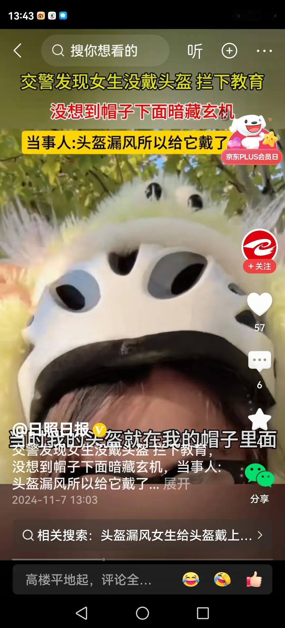 #女生给头盔戴帽子被交警拦下闹乌龙# 是的,视频里看到,女生骑电动车路口被交警拦下。 交警:哎!说你呐!把头盔戴上。 女生:知道说我,可我戴头盔了。 交警:我咋没看到。 女生没言语,把头上毛绒绒的帽子朝后翻了翻,头盔露了出来。此情此景,交警笑了,说,以后再这样把头盔露出一点吧! 话说回来,女生已经戴了头盔,为啥还要费二遍事,头盔上再套个帽子呢?唉!皮裤套棉裤,一定有缘故,头盔漏风啦! (内容取材于网络)