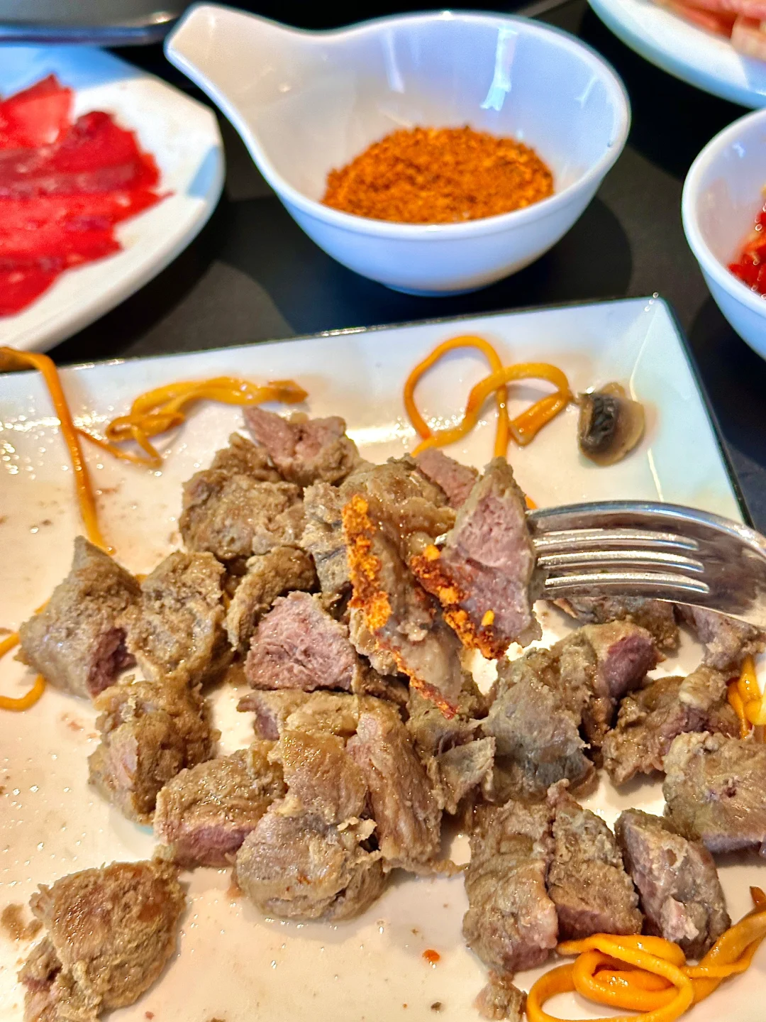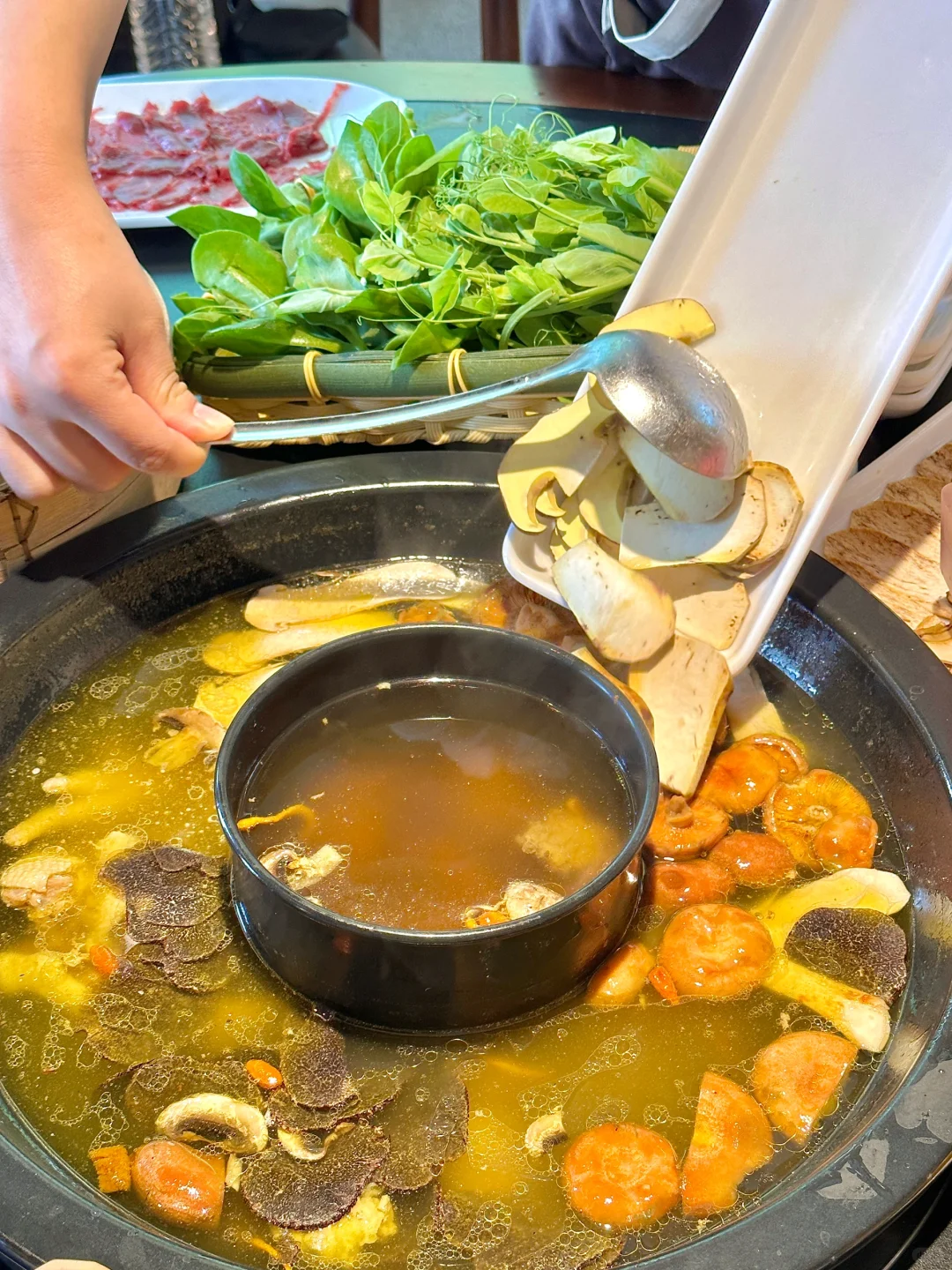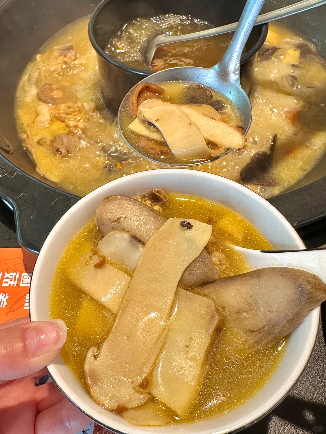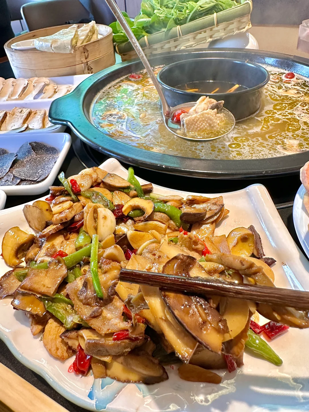 自从吃过一次就像被挂住了 !我都不记得为了这口来汉阳多少次了!!云南空运各种纯野生菌:红葱见手青 、白葱见手青、黑松露、野生鸡丛菌..不用飞云南就可以吃到介么多“山珍”吃货表示太开心~ 先来碗黄陂土鸡汤打底,这个已经很鲜了! 再加上各种野生菌,那汤鲜到没法形容!连喝5碗的就是我!! 爆炒见手青,好好吃啊!太符合我这个武汉土著的口味,一盘子不够我一个人炫的! 特色的刀叉牛肉,每天现切现腌,煮8分钟,沾点干辣椒粉,嘎嘎好吃😋~