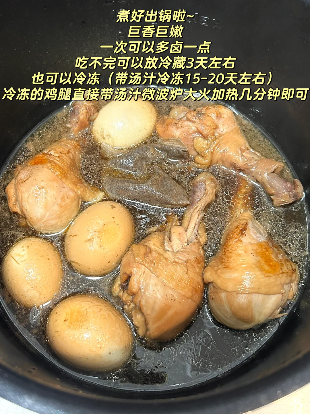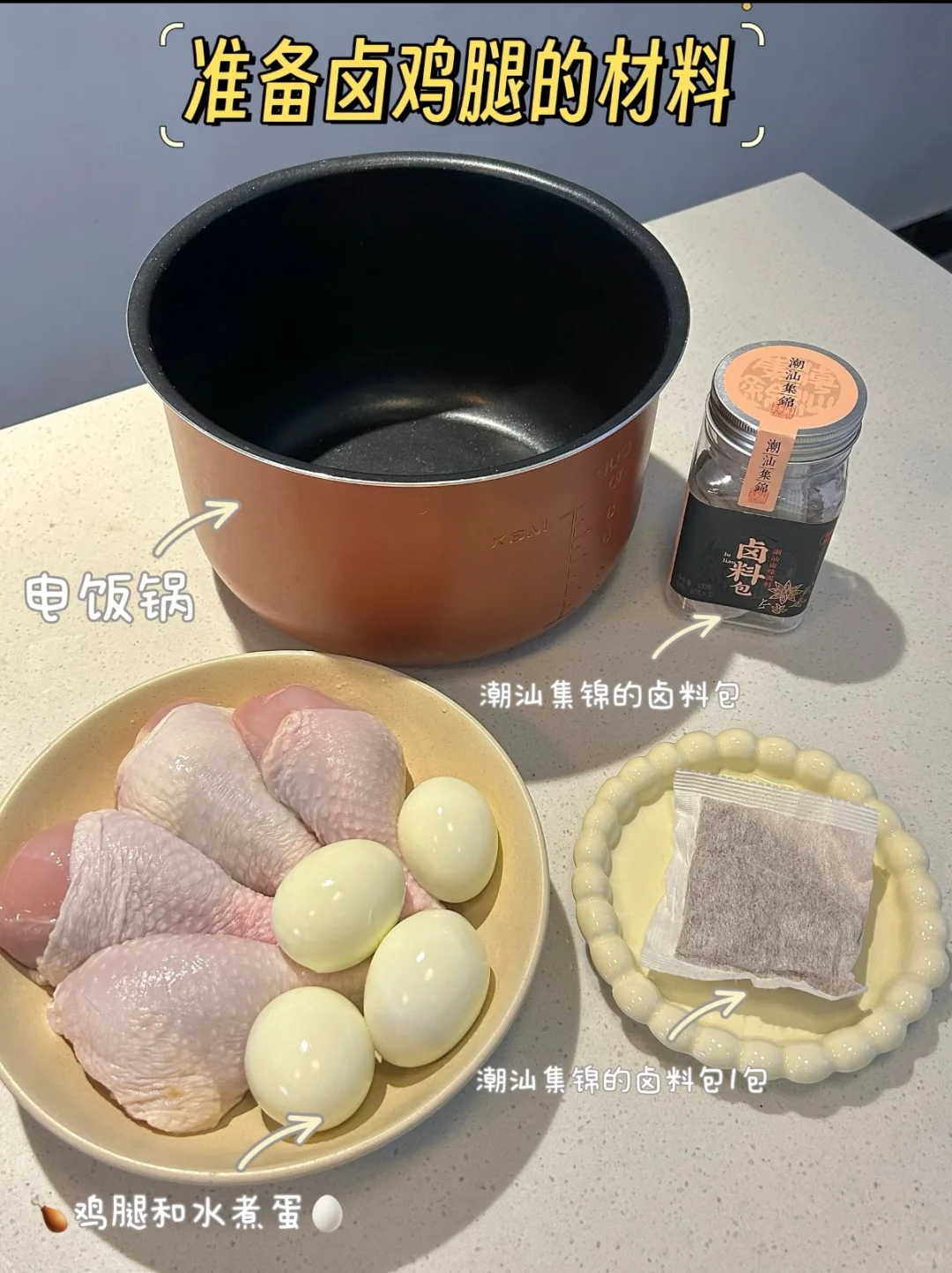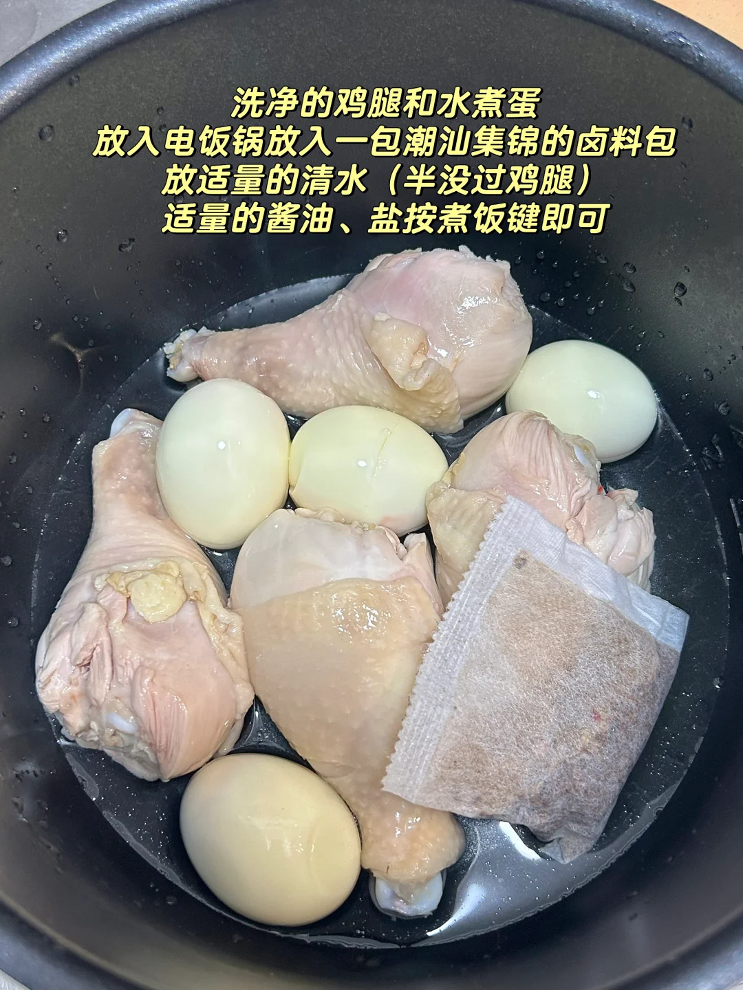 3️⃣洗净的鸡腿和水煮蛋放入电饭锅放入一包潮汕集锦的卤料包,放适量的清水(半没过鸡腿)适量的酱油、盐按煮饭键即可