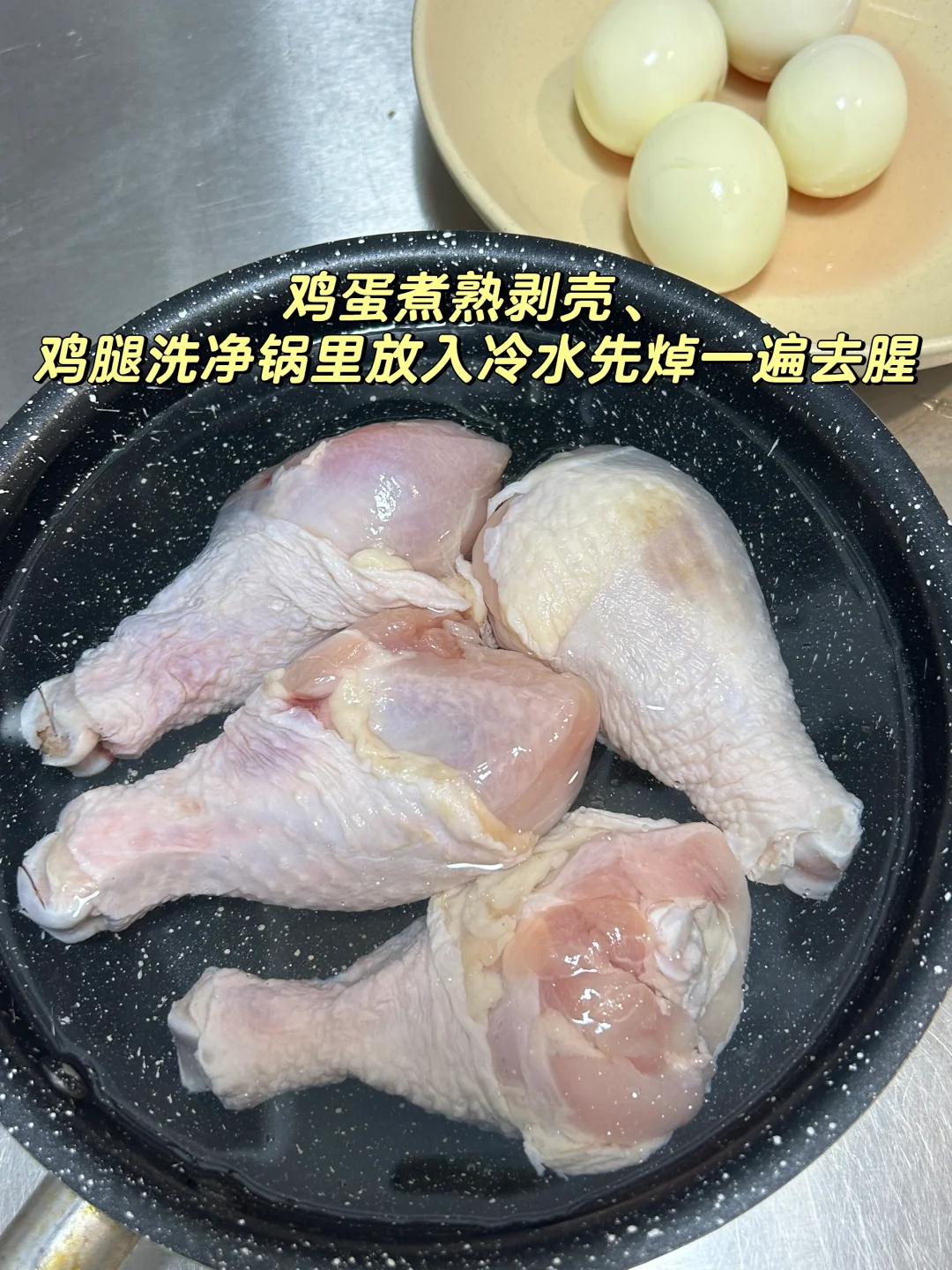 1️⃣鸡蛋煮熟剥壳、鸡腿洗净锅里放入冷水先焯一遍去腥