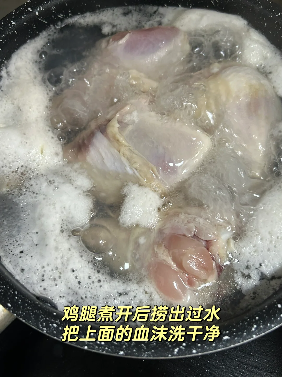 2️⃣鸡腿煮开后捞出过水,把上面的血沫洗干净