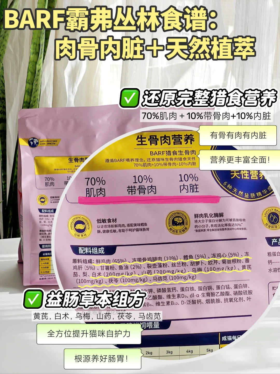 它家的BARF霸弗丛林食谱:肉骨内脏+天然植萃,是相当给力[偷笑R]。别家只盯着肉源🥩、肉含量卷卷卷,它家上王炸,喵喵届的超级食材天然植萃都算了,还把骨骼🦴、内脏也都科学配比进来(7️⃣0️⃣%肌肉+1️⃣0️⃣%带骨肉+1️⃣0️⃣%内脏),直接把完整猎物饮食结构,送到小猫的嘴里。更丰富的饮食,更完整的营养结构,能提升猫咪🐱天生复原力,通过每顿饭,越吃越健康👍👍