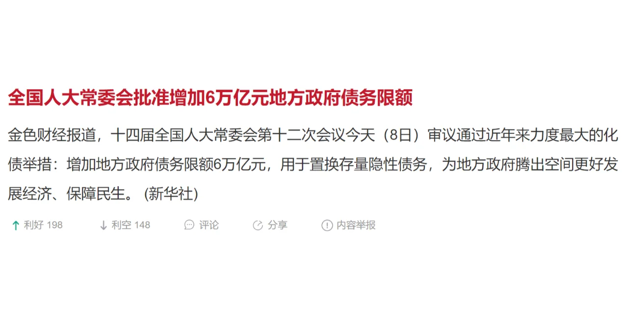 全国人大常委会批准增加6万亿元地方政府债务限额
