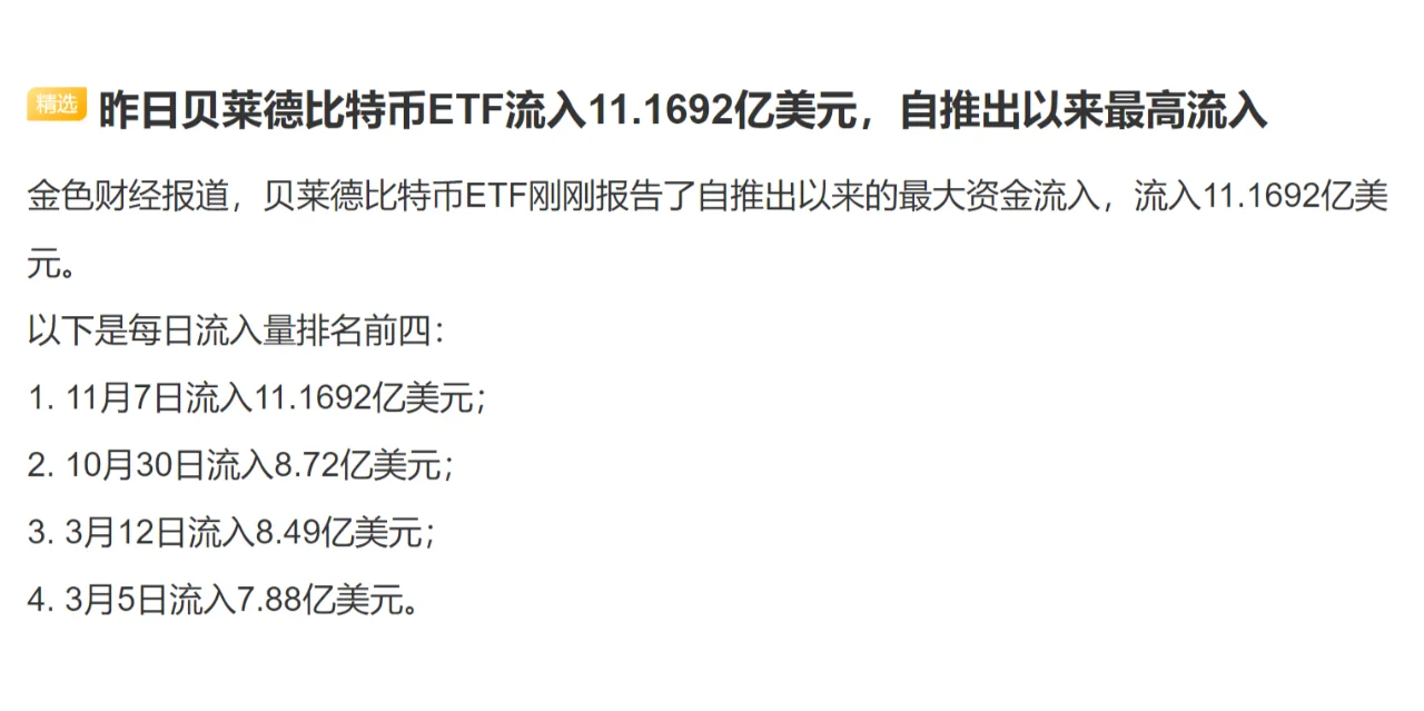 昨日贝莱德比特币ETF流入11.1692亿美元,自推出以来最高流入