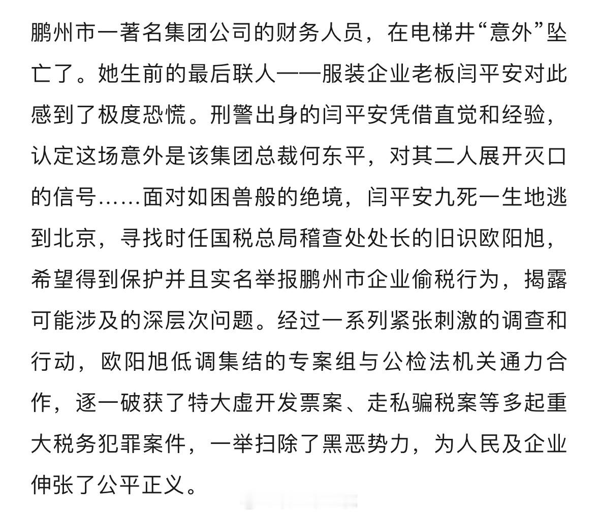 鹏州市一著名集团公司的财务人员,在电梯井“意外”坠亡了。她生前的最后联人——服装企业老板闫平安对此感到了极度恐慌。刑警出身的闫平安凭借直觉和经验,认定这场意外是该集团总裁何东平,对其二人展开灭口的信号……面对如困兽般的绝境,闫平安九死一生地逃到北京,寻找时任国税总局稽查处处长的旧识欧阳旭,希望得到保护并且实名举报鹏州市企业偷税行为,揭露可能涉及的深层次问题。经过一系列紧张刺激的调查和行动,欧阳旭低调集结的专案组与公检法机关通力合作,逐一破获了特大虚开发票案、走私骗税案等多起重大税务犯罪案件,一举扫除了黑恶势力,为人民及企业伸张了公平正义。