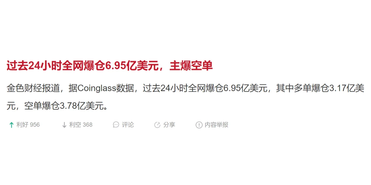 过去24小时全网爆仓6.95亿美元,主爆空单