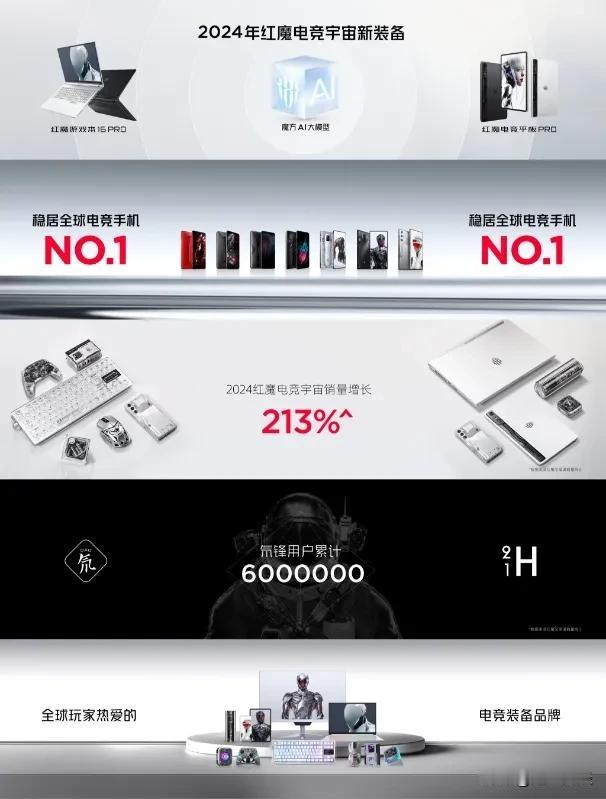 红魔10 PRO系列新品发布: 2024年红魔电竞宇宙三大补强,电竞装备「专业更全面」! ①【红魔稳居全球电竞手机NO.1】 ②【2024红魔电竞宇宙销量增长213%】 ③【红魔高端系列“氘锋”,用户累计6000000】