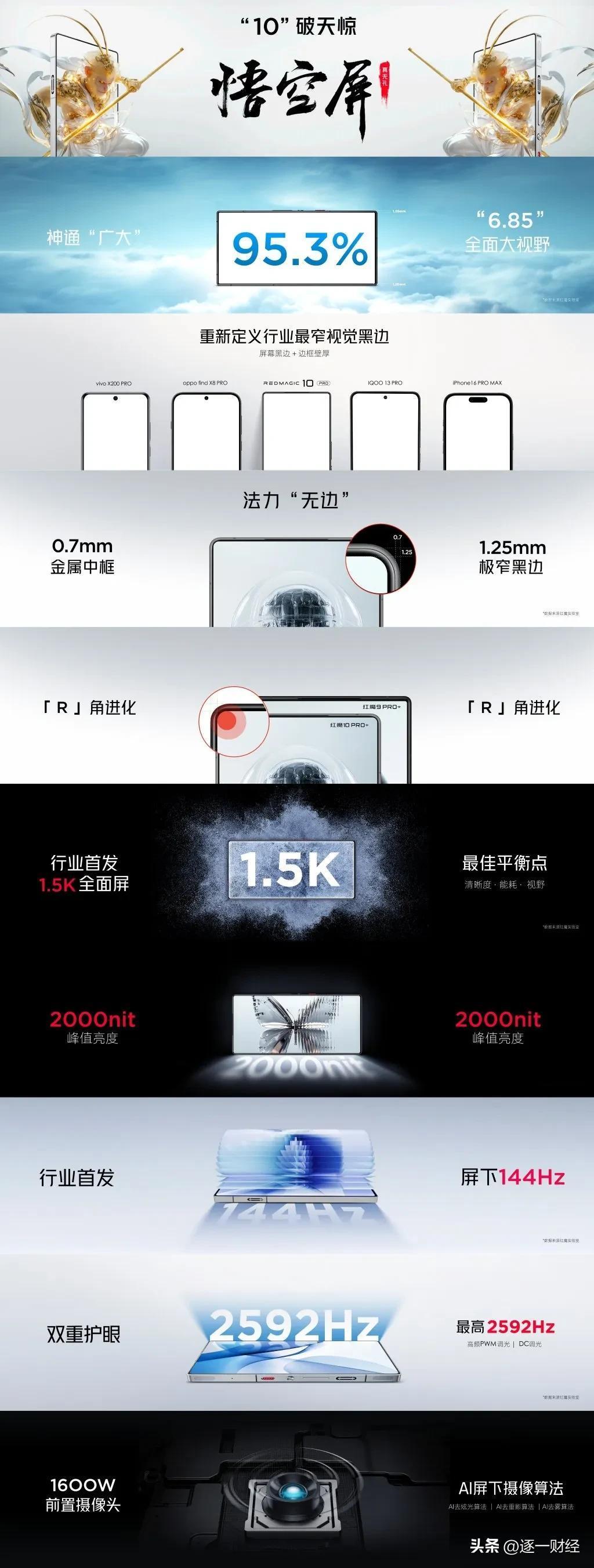#悟空屏 真无孔# 红魔与京东方联合打造!带来全面视效! ①【行业最高屏占比】6.85英寸,95.3%屏占比 ②【行业极窄视觉黑边】1.25mm最窄黑边+0.7mm最窄边框壁厚 ③【行业最高分辨率全面屏】首发1.5K全面屏 ④【行业首发最高刷全面屏】首发144Hz全面屏 ⑤【行业最高亮全面屏】首发2000nit峰值亮度全面屏 ⑥【双重护眼技术】最高支持2592Hz,支持「高频PWM调光」、「 DC调光」 ⑦【新一代AI屏下摄像技术】三重算法,前摄隐藏及自拍效果更好