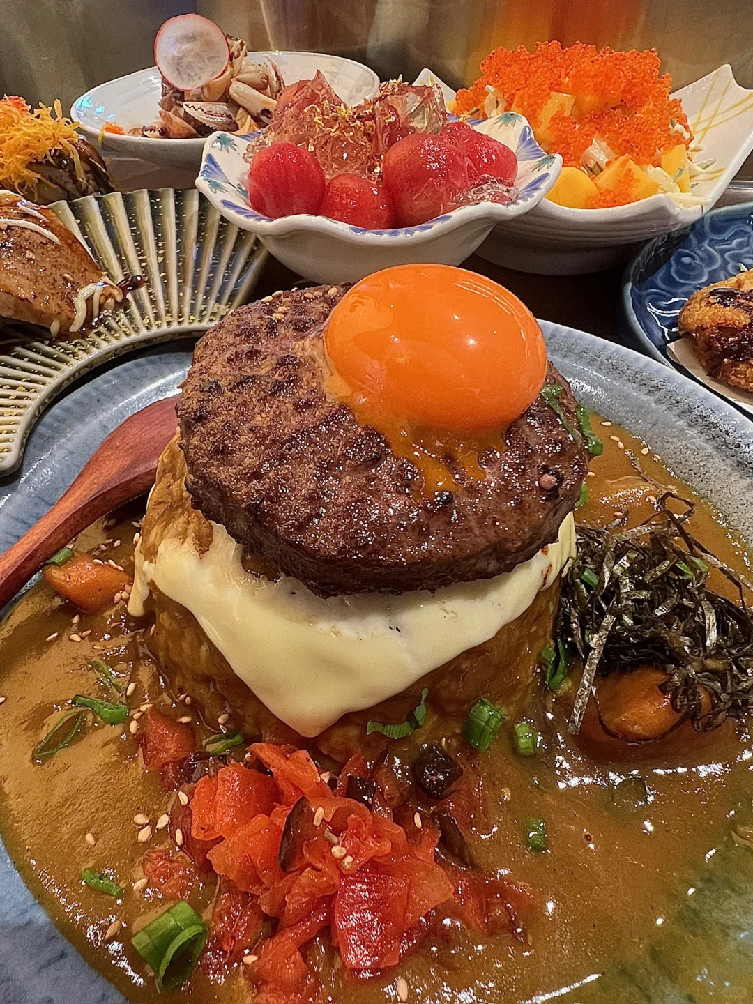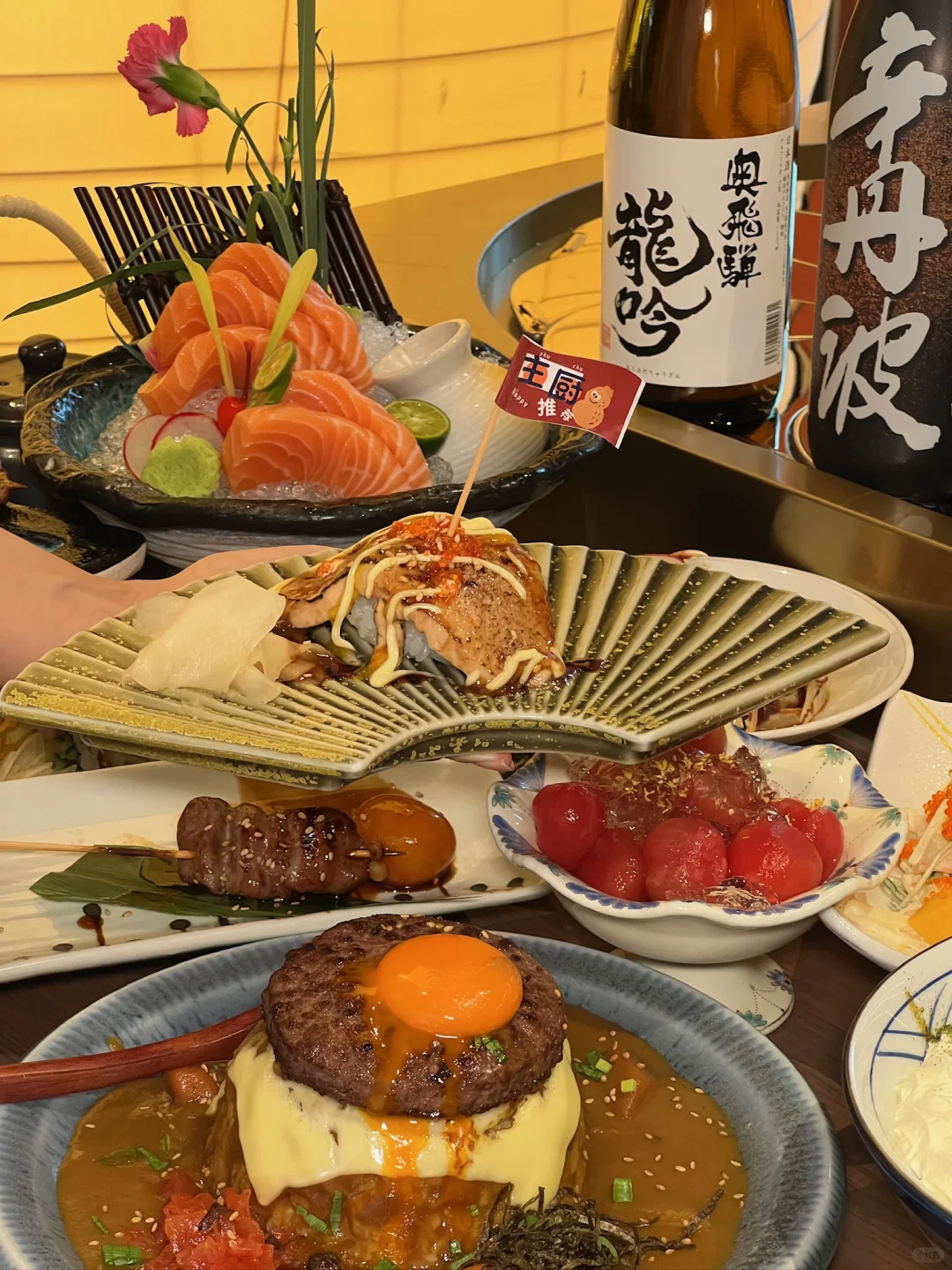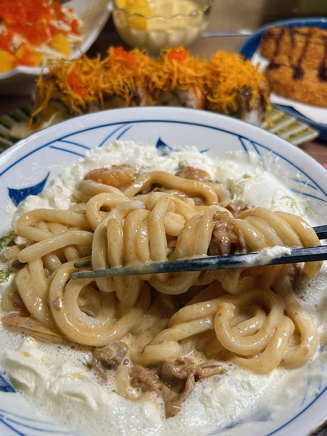 和牛汉堡咖喱饭🍛碳水脑袋和肉食星人都忍不住了!! 超厚实的牛肉饼➕无菌蛋➕咖喱饭 蛋液轻轻一戳就流心 牛肉汁饱满油脂香十足 拌在一起吃真的超级过瘾😭😭 是哪位天才发明的奶油咖喱乌冬面啊啊啊啊啊!! 奶香十足,顺滑细腻,面条很有韧劲这一口下去谁不迷糊啊?🤩 店里还有Yakitori烧鸟、寿司、手握...种类丰富的咧