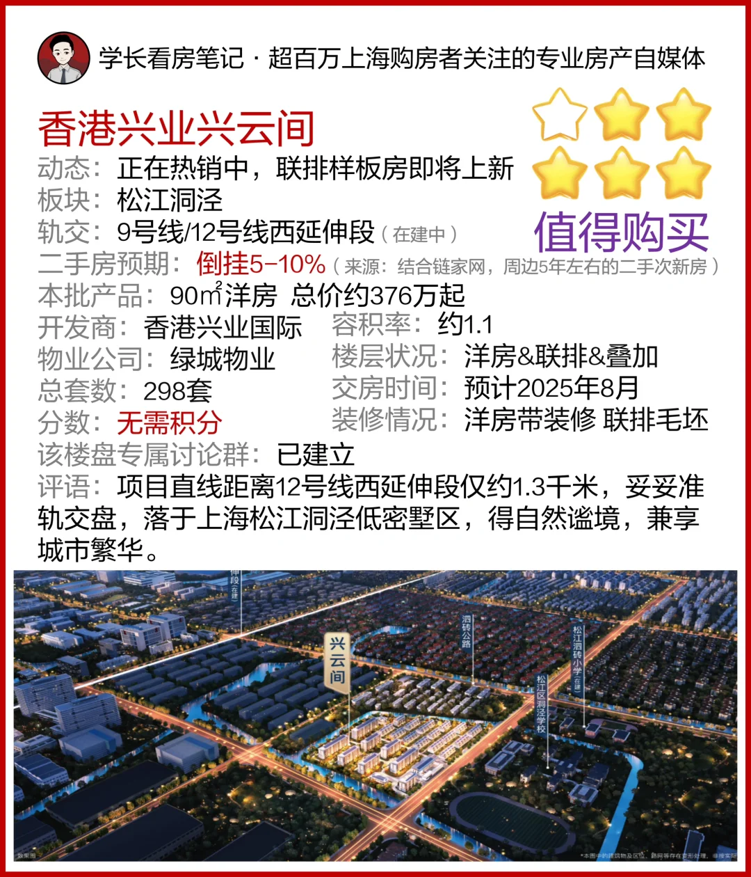剩余少量建面约90㎡洋房在售 ⛩项目名称:「香港兴业·兴云间」 👑项目简介:松江洞泾 低密住宅 🗣最新动态:热销中 📍区域板块:松江洞泾 🏠产品介绍:90㎡洋房在售 🛍️商业配套:明中广场,亚繁亚乐城、同乐生活广场,松江万达、五龙商业广场、莘庄龙之梦、七宝万科广场等 🚇交通配套:9号线洞泾站 🏥医疗配套:洞泾医院、洞泾镇卫生服务中心 大家对这个盘怎么看,会好卖吗?我们评论区聊聊吧~