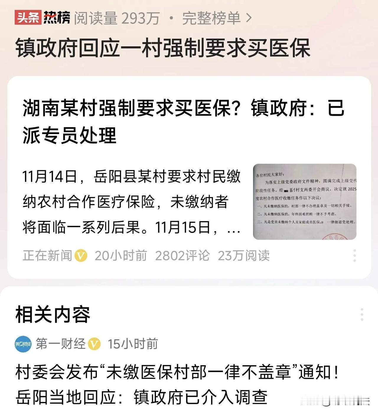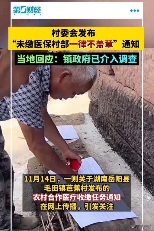 都是自愿交的!湖南,某村民到村里盖章,让村里出一个证明,没想竟看到村民委员会盖公章的通知说,凡未缴纳医保的,村部一律不办理盖章及一切相关手续,而且年终困难照顾一律不予考虑。村民大惊失色 ,将通知拍了照发网上,引起了热议。当地镇政府表示,已接到相关反映,将派人到村里核实了解情况。 (来源:大风新闻) 老冯是湖南岳阳某村的村民,今年六十出头,为人淳朴,勤勤恳恳,却又命运多舛。 由于家境贫寒,老冯成了村里的困难户,好在现在帮扶条件好了,倒也没有缺了吃穿。 今年年初,村委会通知村民缴纳医保费用。往年,老冯都会按时缴纳,他一个困难户,再遇到生病住院麻烦就大了。 然后,今年个人缴费为400元/人一年,虽然较上年只增加20元,但对老冯而言,这是一笔不小的开支,都够他一个月生活费了。 经过一番深思熟虑,老冯决定今年不缴纳医保费用。他安慰自己:“我身体硬朗,应该不会有什么大问题。省下来的钱,可以多买不少东西。” 或许是不交医保的人多了,也或许是其他原因,村委会发布通知称,经村支两委开会商议,决定就农村合作医疗收缴任务作以下决议: 凡未缴纳医保的,村部一律不办理盖章及一切相关手续;凡未缴纳医保的,年终困难照顾一律不予考虑。 通知落款时间为2024年11月14日。 事发后,当地医保局的工作人员表示,缴纳医保是利国利民的好事,该村村委会的方式方法存在不当。各单位在宣传、执行政策时,一定要注意方式方法,真正把好事办好。 法律怎么看这事,缴纳医保是权利还是义务? 首先,《基本医疗卫生与健康促进法》第八十二条,基本医疗服务费用主要由基本医疗保险基金和个人支付。国家依法多渠道筹集基本医疗保险基金,逐步完善基本医疗保险可持续筹资和保障水平调整机制。 公民有依法参加基本医疗保险的权利和义务。 参加基本医疗保险既是权利,又是义务,这要怎么理解? 这句话的意思是,从法律层面来说,参加基本医疗保险是公民的义务,但具体的执行过程中仍以自愿为基础,并加以引导。 懂了吧,参加医保是自愿的。 所以政策规定,城乡居民医疗保险,对所有人的参保规定都是自愿性质的。城镇职工医疗保险则不同。对单位参保人来说,是强制的。而对灵活就业参保人来说,则是自愿的。 其次,今年个人缴费为400元/人一年,较上年只增加20元。如果属于政策上的特困人员,还可以由政府掏腰包,免费参保。 投入很少,但城乡居民医保参保人至少获得50%以上的报销待遇(具体报销标准,各地有不同规定),投入和产出的性价比还是很好的。 而且国家政策层面,在不断提高城乡居民医保的报销比例和补贴标准,越来越划算! 看起来只有傻子才会不参保,但为什么今年很多村民开始不参保了呢? 除了有些人抱有侥幸心理外,最大的原因无非是觉得价格贵了。 对于城市里的人来说,400块钱或许不算什么,一两顿饭的事情,但对农村的人而言,400块钱可能是他们一家人一个月的生活费。 现在打工挣钱难,能少支出一分是一分,钱都让医院和诊所挣了,所以村民才不愿意交。 最后,一个叫“往事随风”的网友表示,平时10元的药,收五十元,医保保险30元,自己还要付费20元,大家有没有同感? 一名叫“自由的明月”的网友说,刚开始医保社保都是自愿,大家都愿意交,现在却成了强迫,不交不行,为什么?真正得到好处的又是谁? 对此,您怎么看? 秋日生活打卡季 关注@蚂蚁说法关注时事新闻和法律