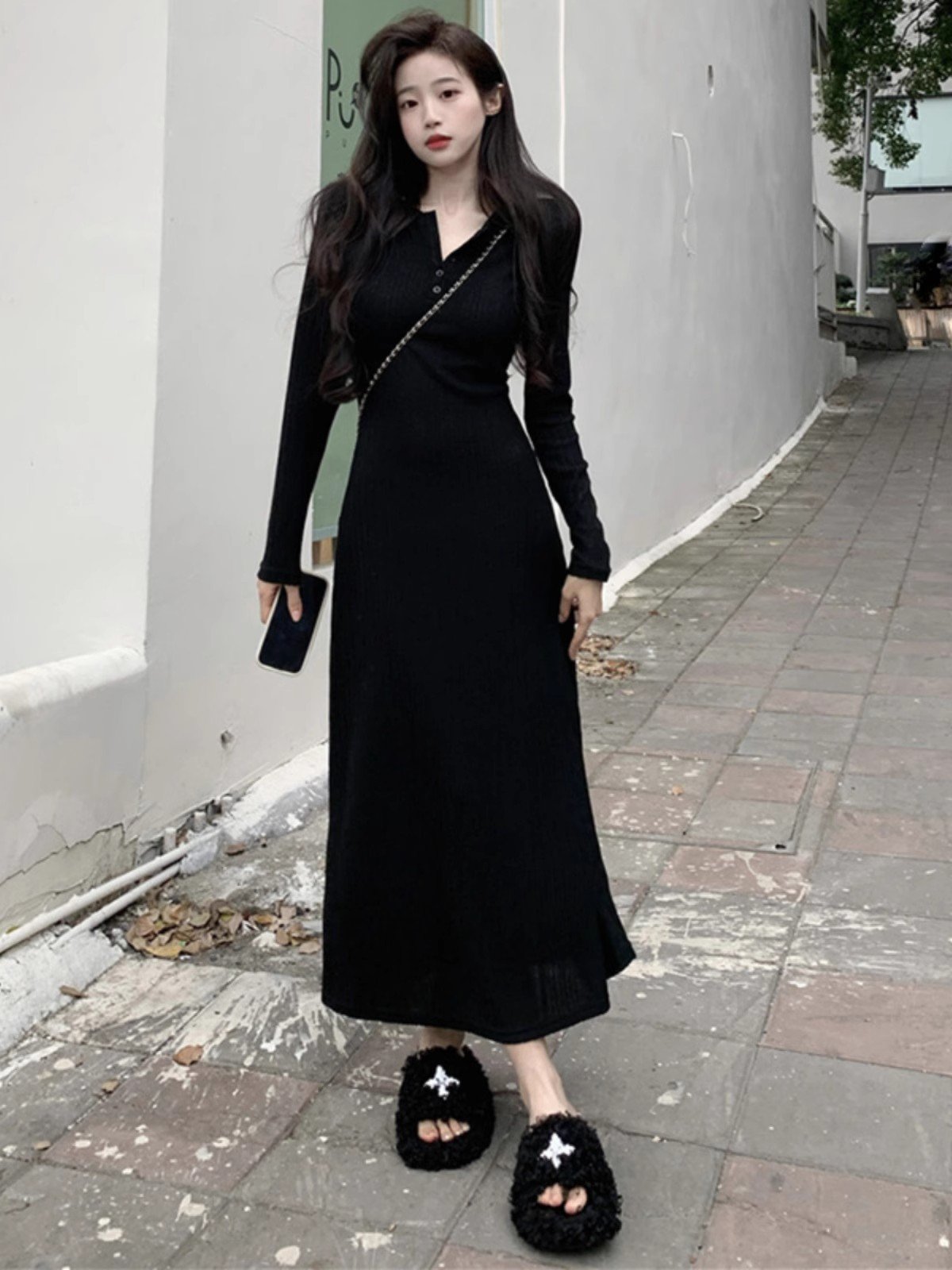 法式黑色吊带挂脖连衣裙女秋冬富家千金高级