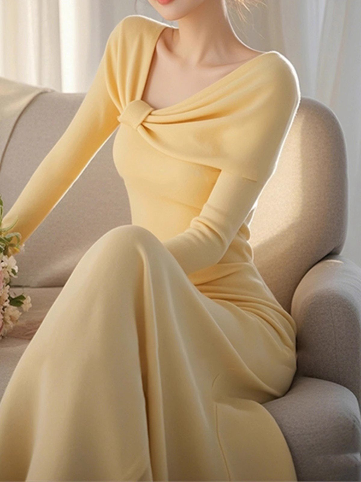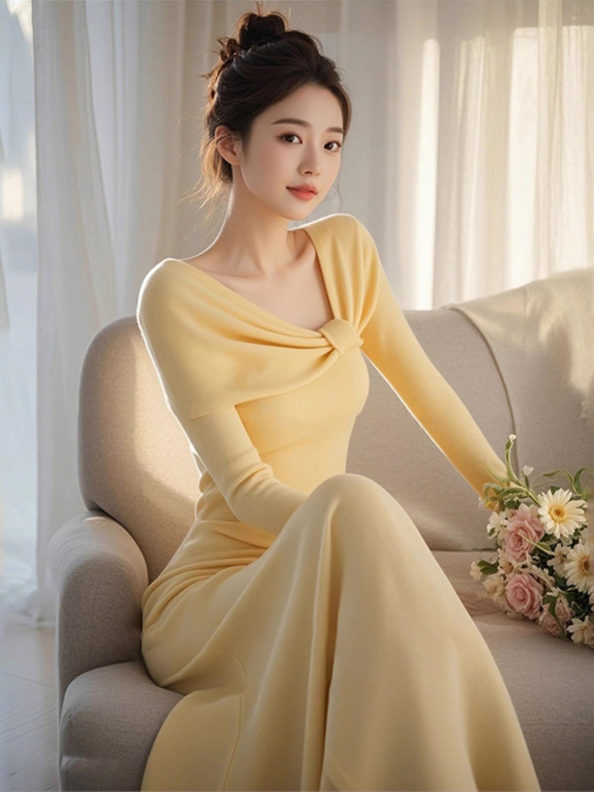 黄色花朵v领长袖针织连衣裙女秋季修身温柔
