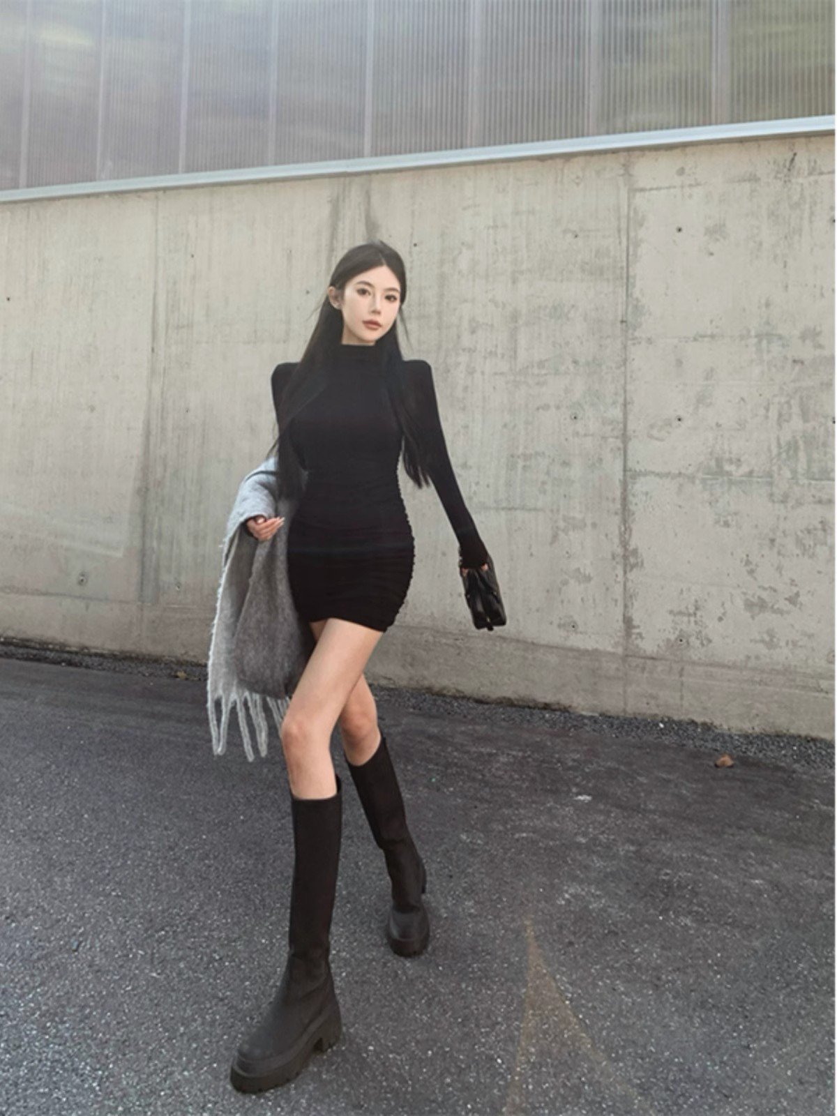 半高领灰色针织连衣裙女秋冬内搭打底配大衣