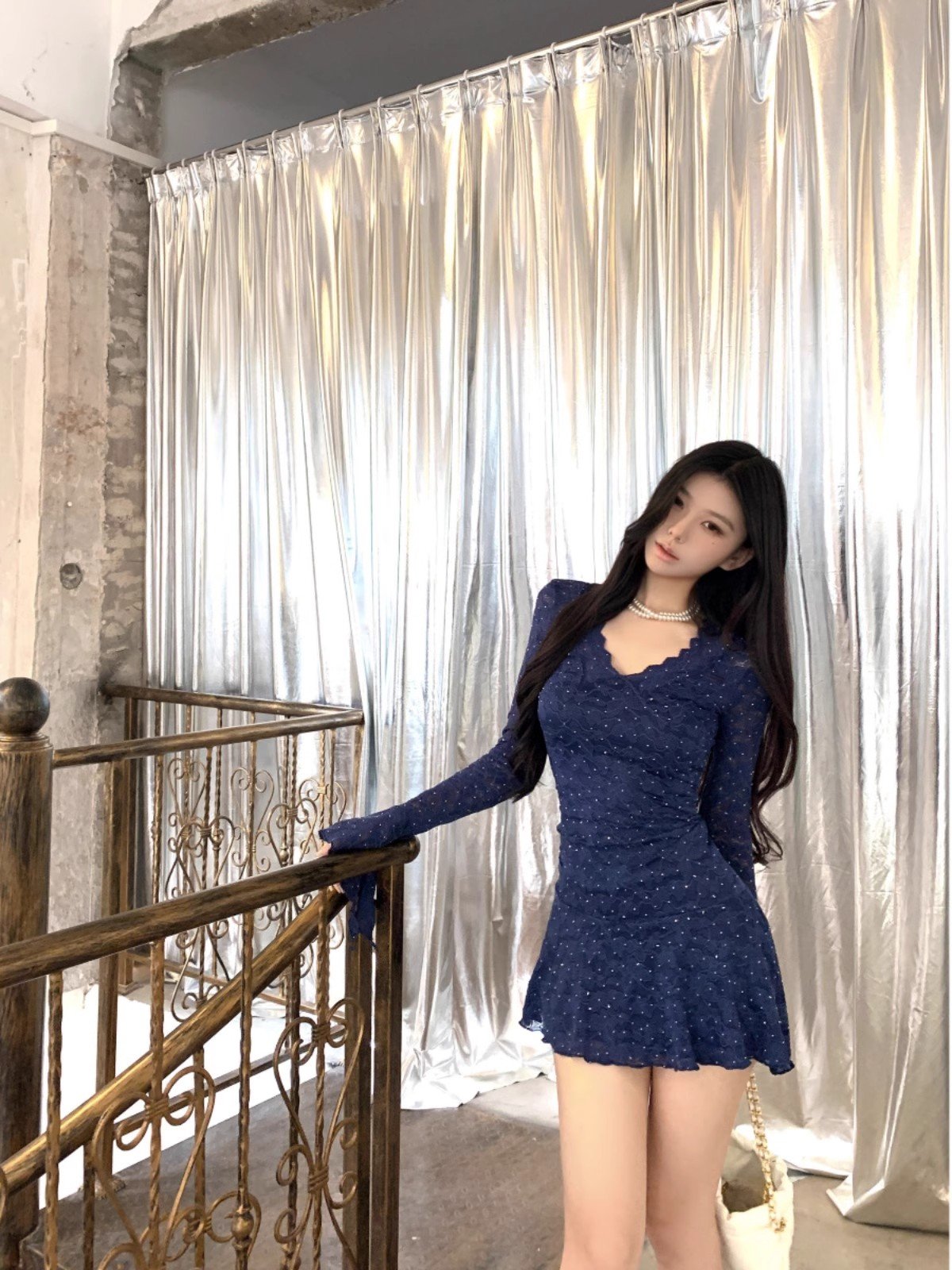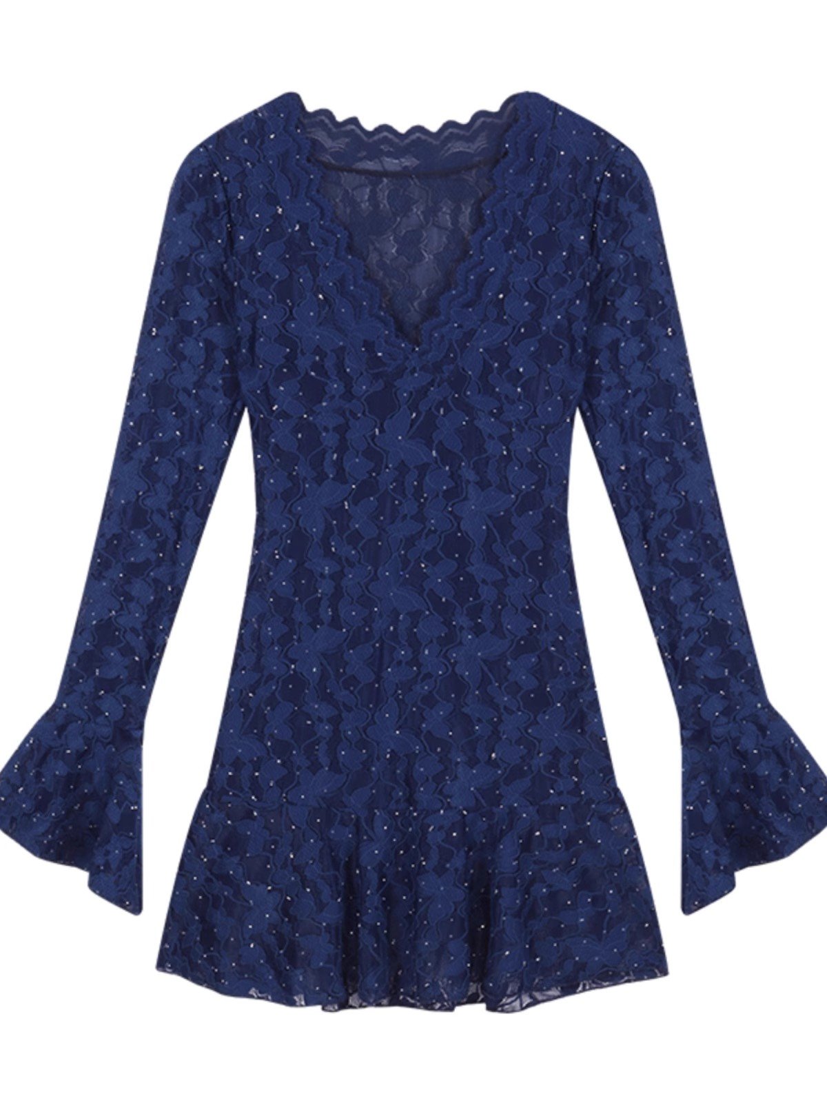 性感纯欲蓝色烫钻长袖连衣裙女秋季收腰修身