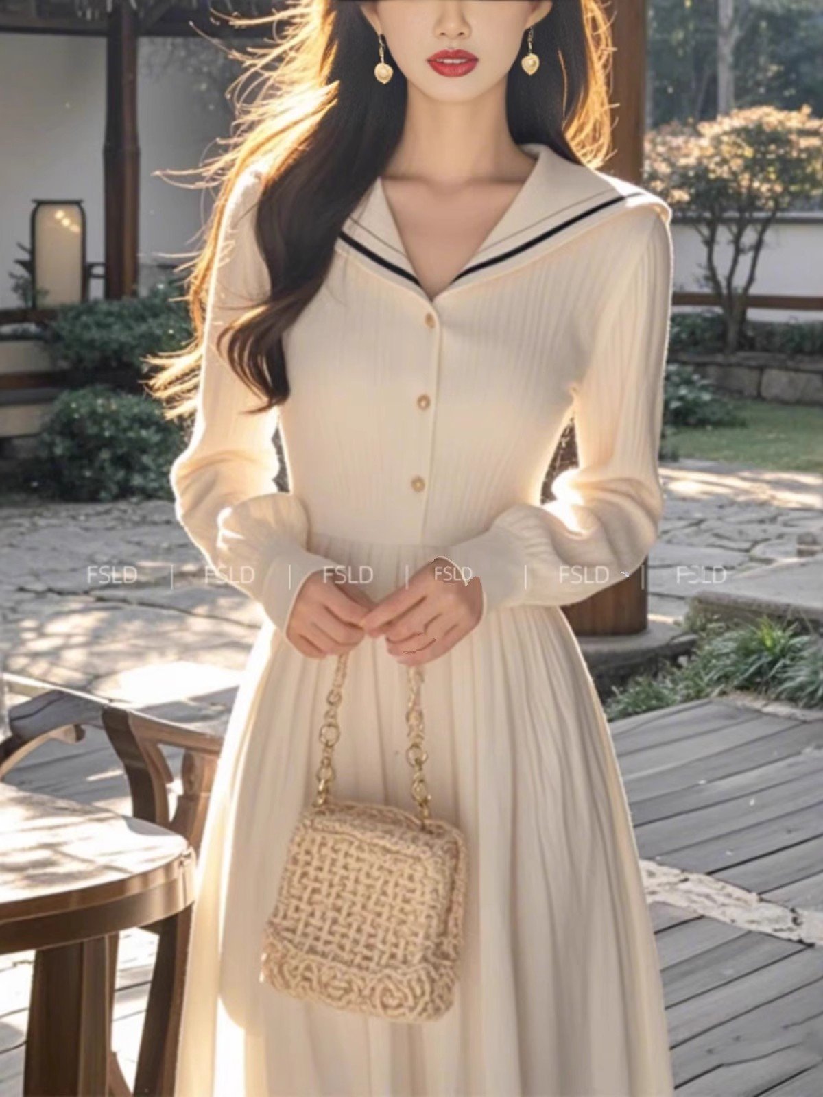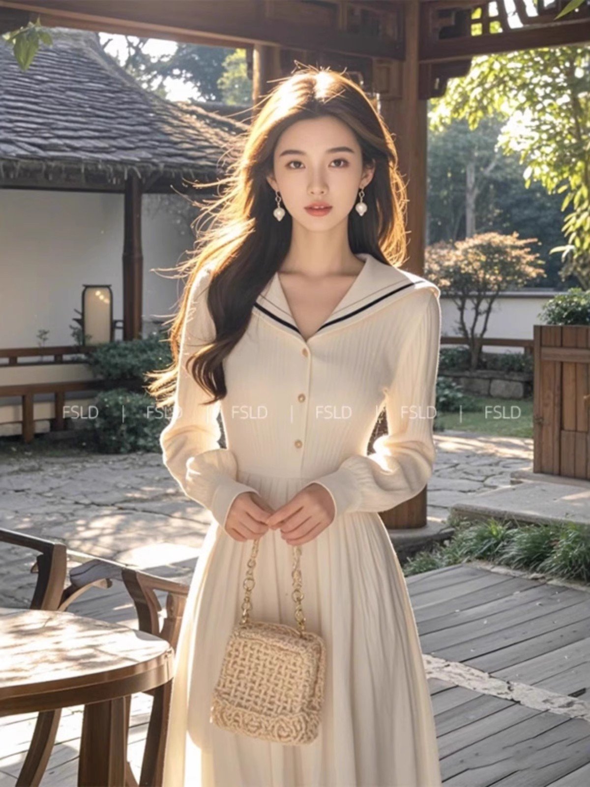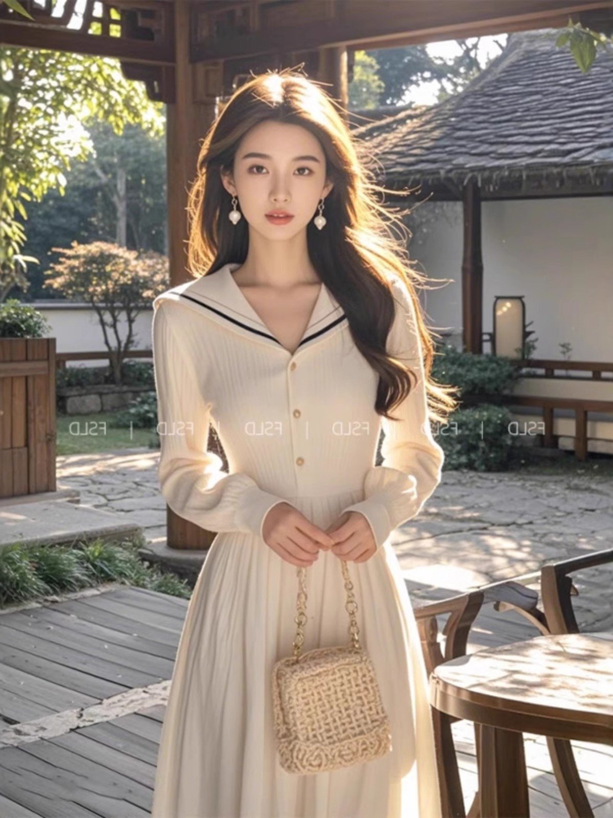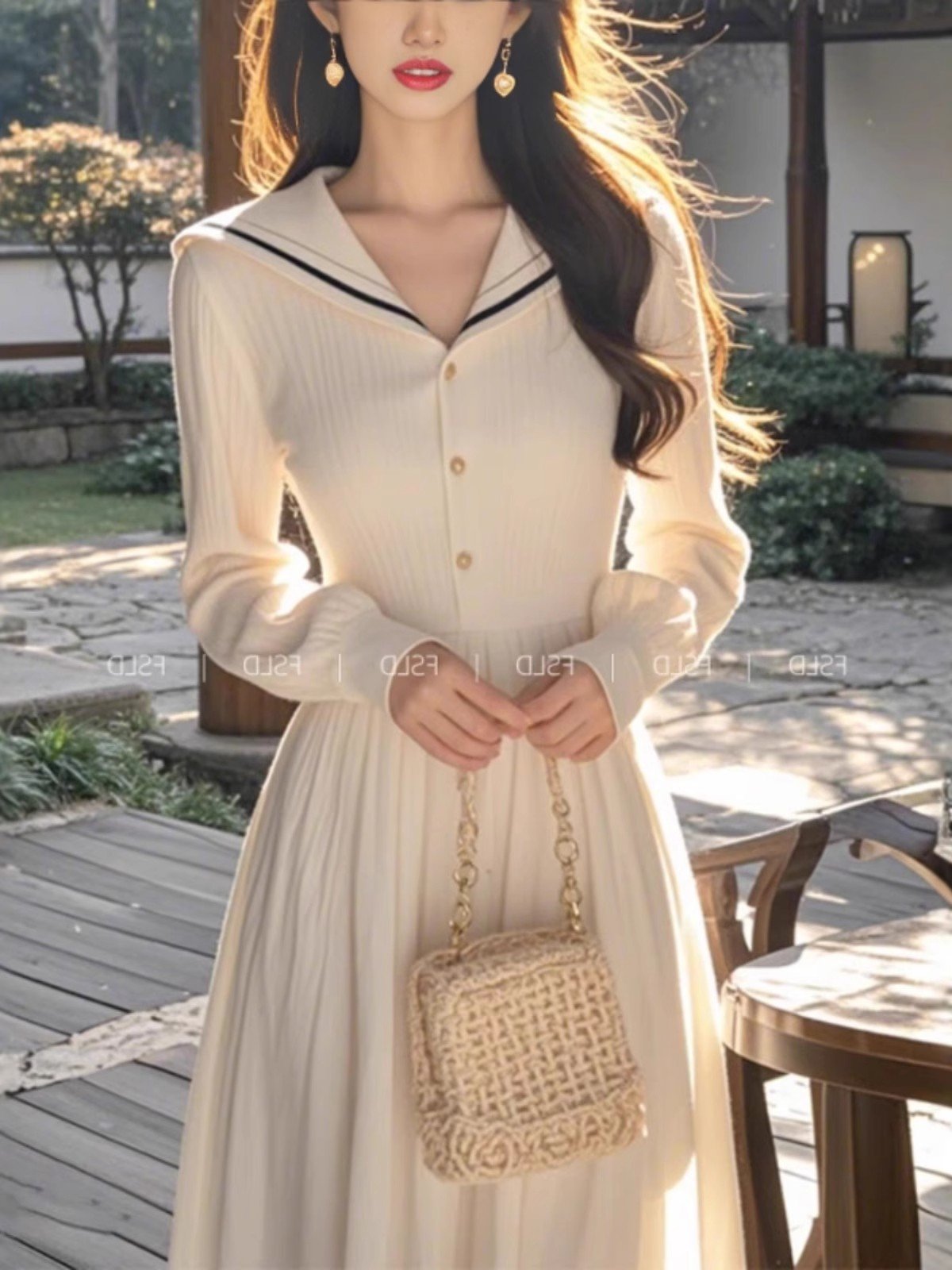 法式设计感白色长袖连衣裙女秋冬富家千金花
