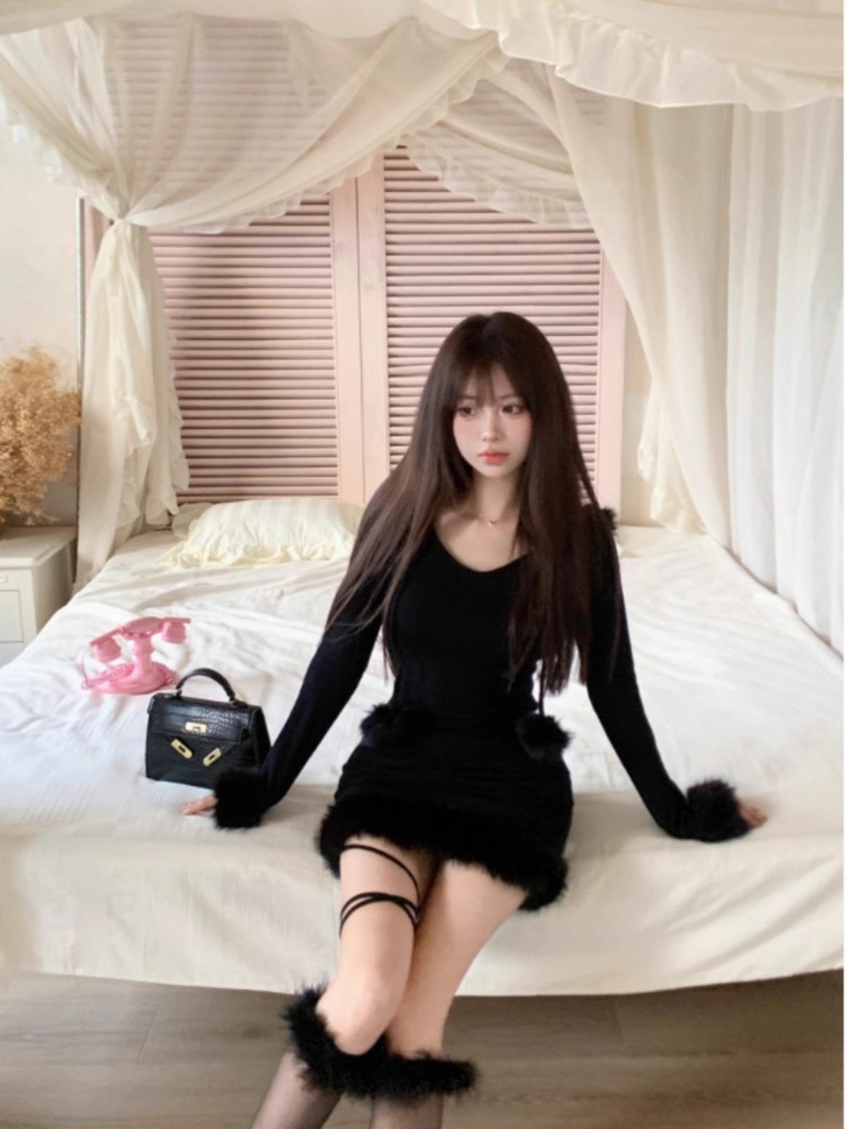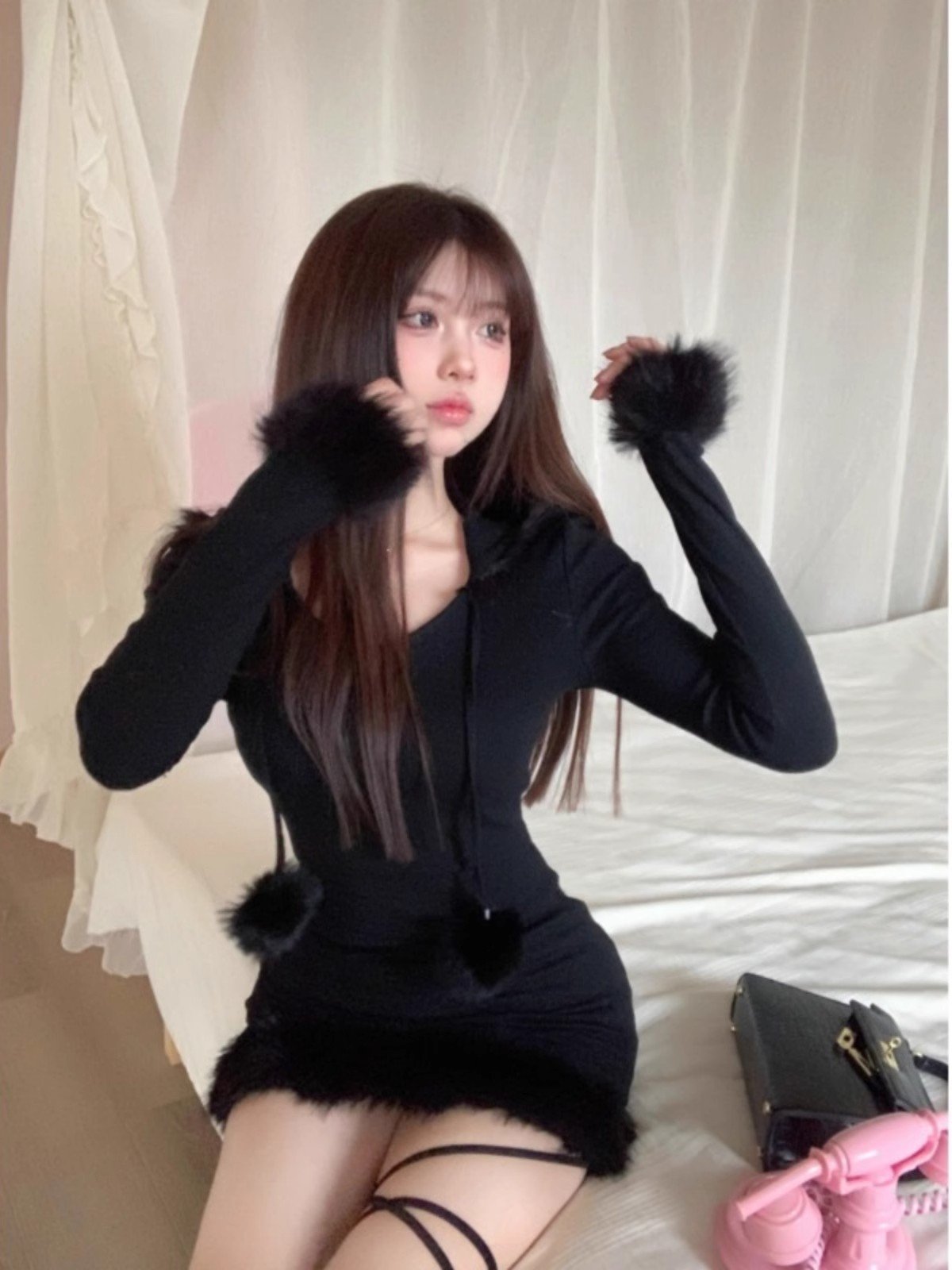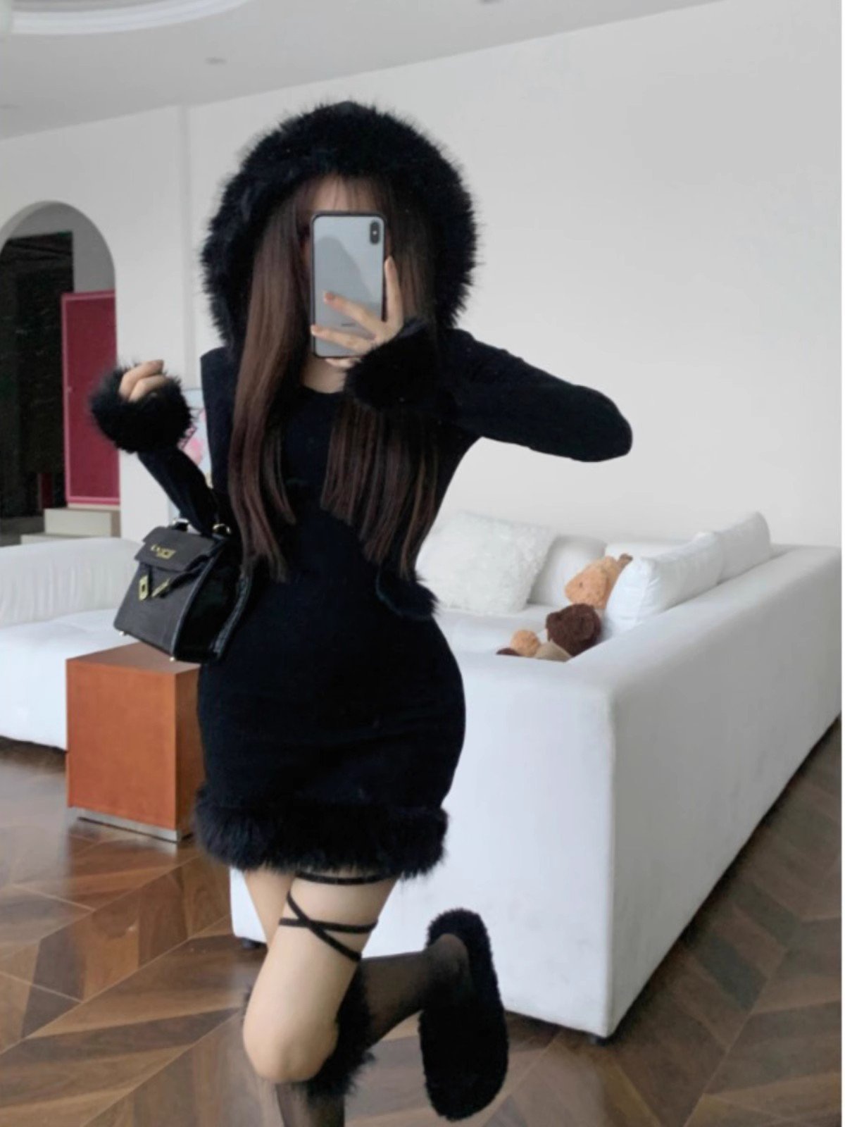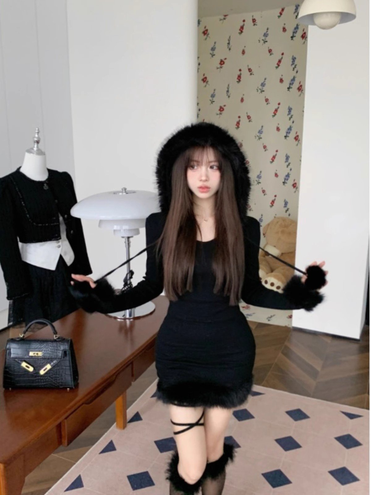 辣妹毛绒绒拼接连帽连衣裙女秋冬新款黑色