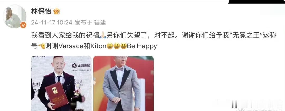 很多人都替林保怡意难平,很多人都觉得他应该获得金鸡奖影帝,很多人称他为无冕之王。 11月17日,林保怡对于憾失金鸡影帝也作出了回应,他的回应展现了高情商,心态也是特别的豁达,称有图片就已经感到很满足了。 金杯银杯不如老百姓的口,虽然这次林保怡没有获得金鸡奖影帝,但是一点也不影响他在众人心中的优秀。 林保怡已经不需要用奖杯来证明自己了,演了这么多年的戏了,出演了很多经典的影视作品。 曾以歌手出道,但与公司意见不合而转型成了演员。 他的代表作品有《鈭证实录》、《妙手仁心》、《金枝欲孽》等。