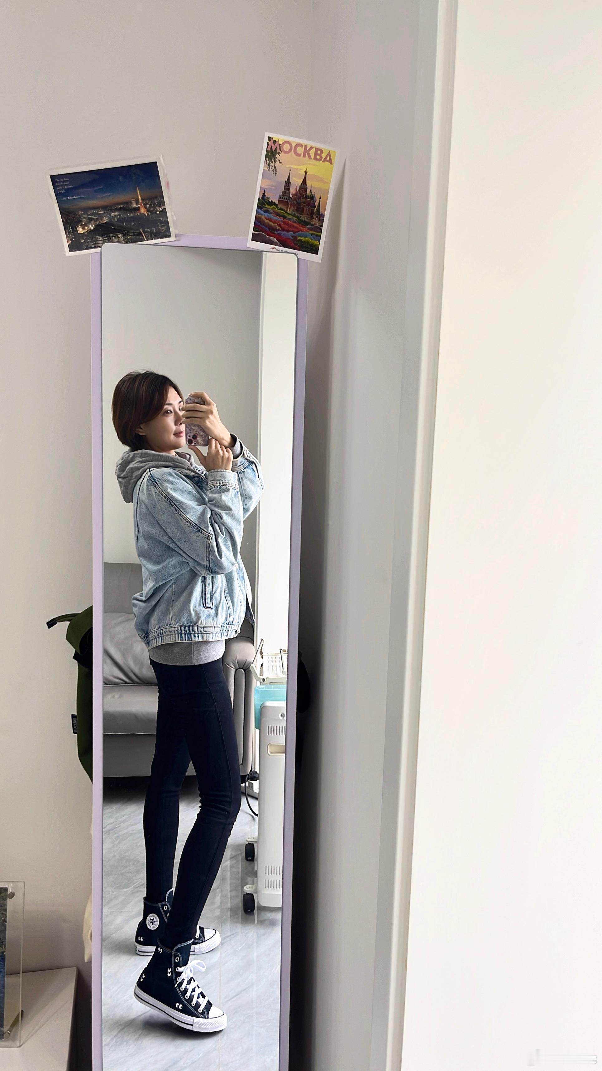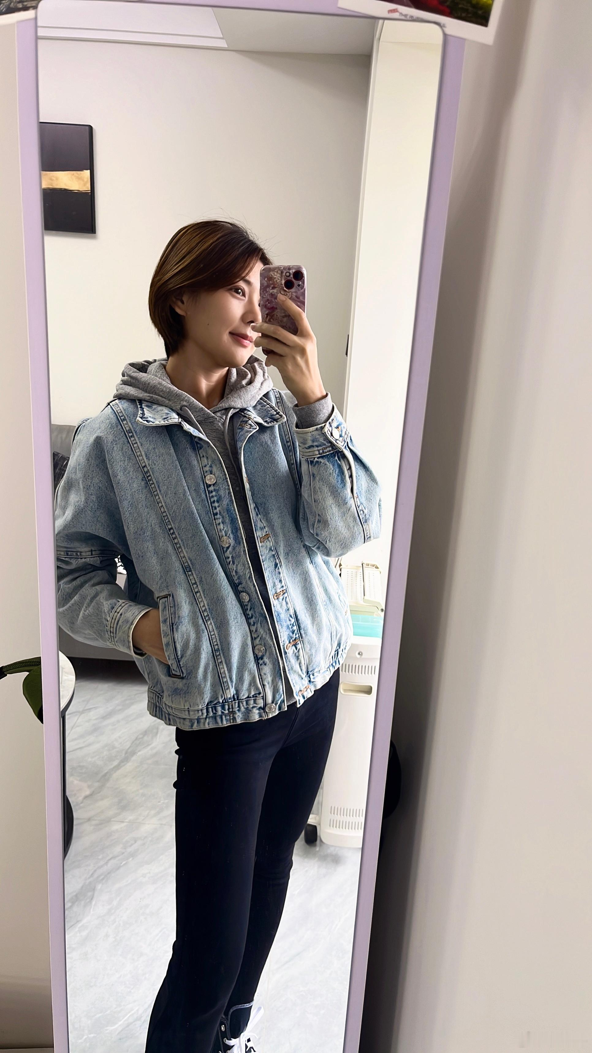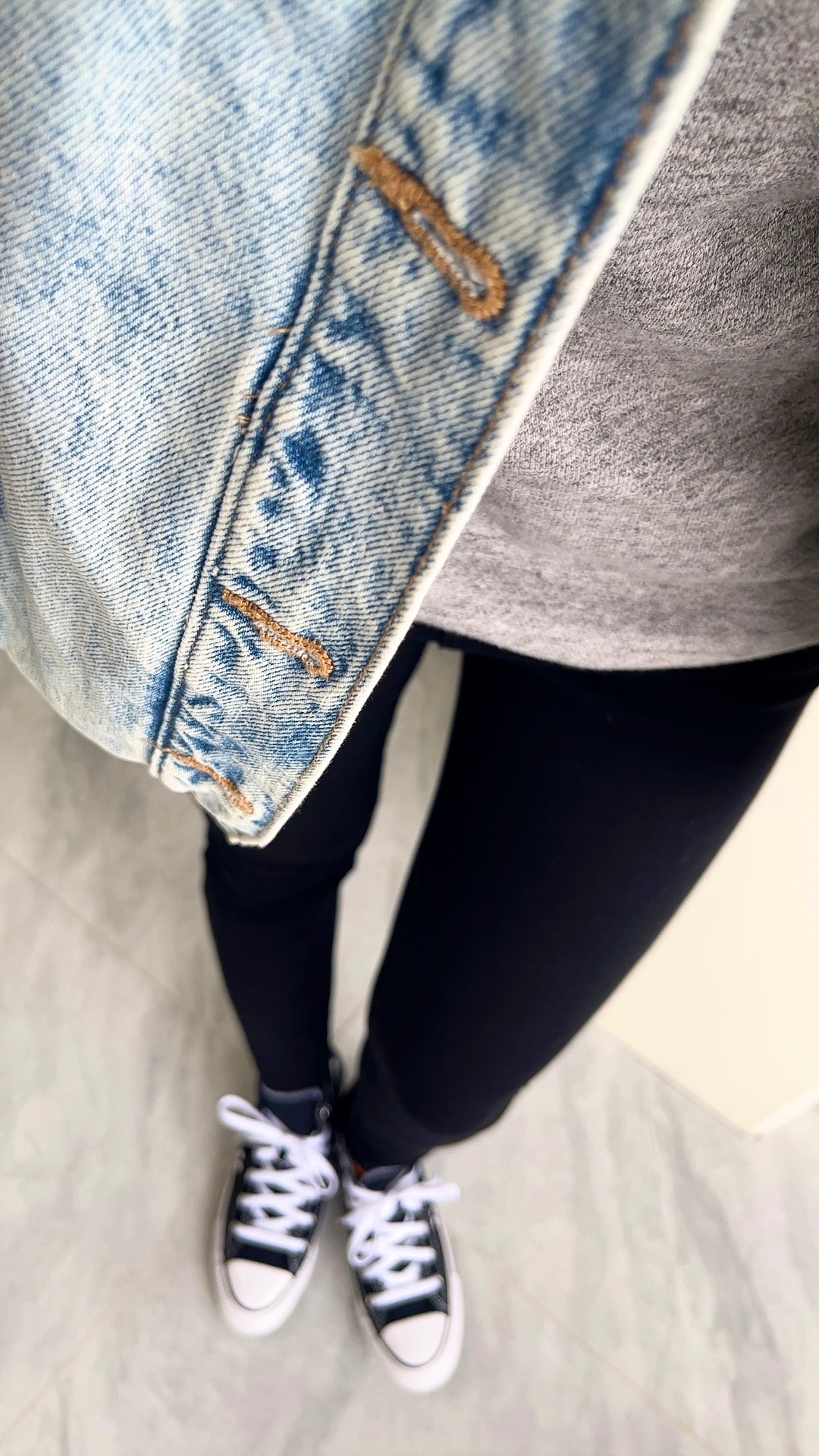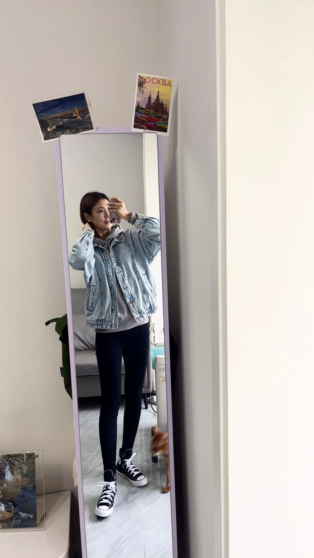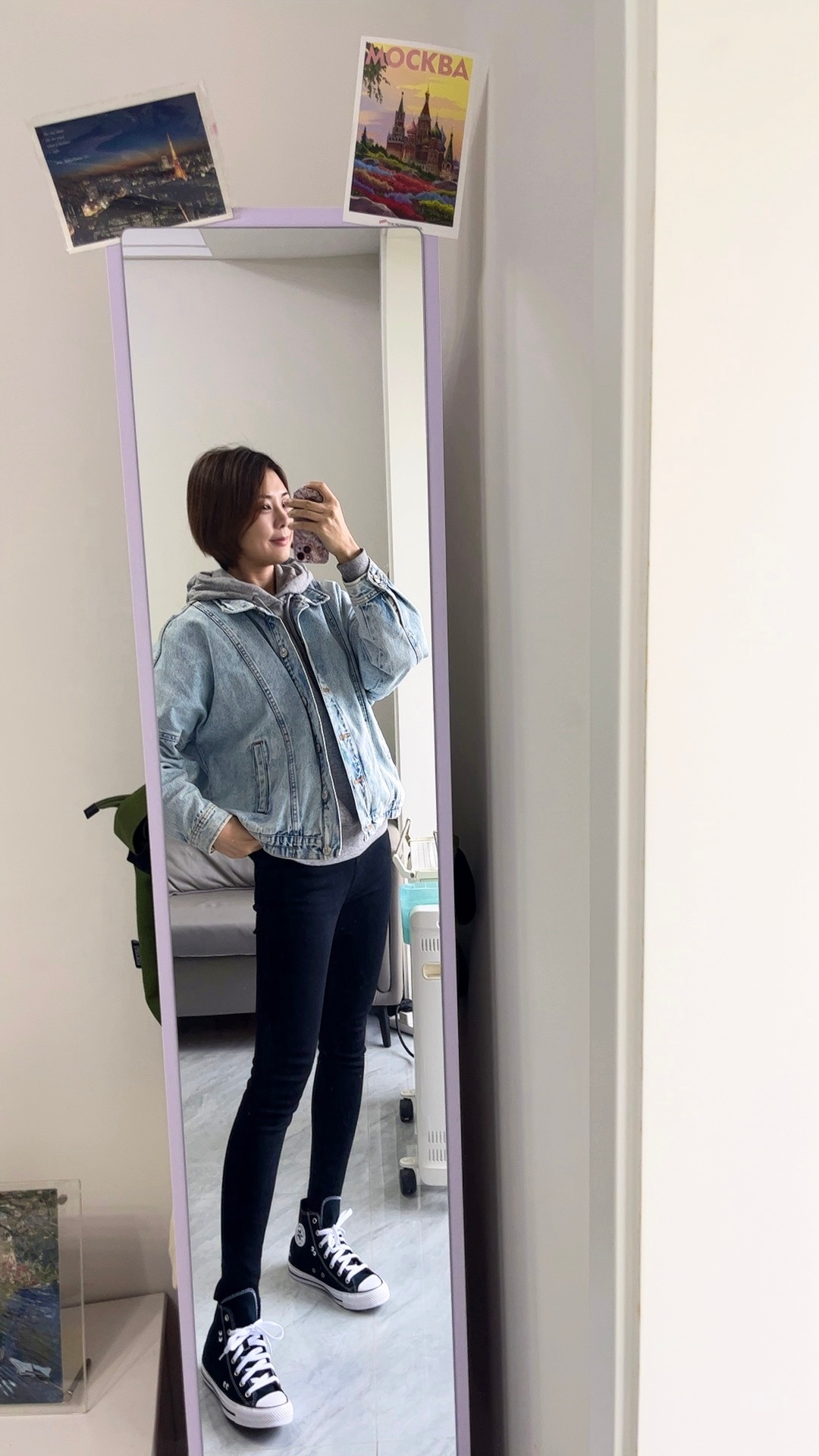 今天穿什么 周末宅家追剧的复古牛仔穿搭[偷乐][偷乐][偷乐]❗️麻灰色帽衫穿在牛仔外套下,很有层次感,脖子还暖和[笑哈哈],黑色紧身牛仔裤…还是加绒的,果然腿腿🦵瘦下来好多[允悲];紧身裤正好配那双很多小眼睛的黑色高帮帆布鞋[偷乐]