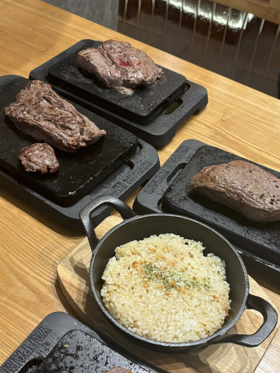在高温岩板上煎制的牛排外焦里嫩,搭配不同酱料,每一口都是不同的享受!