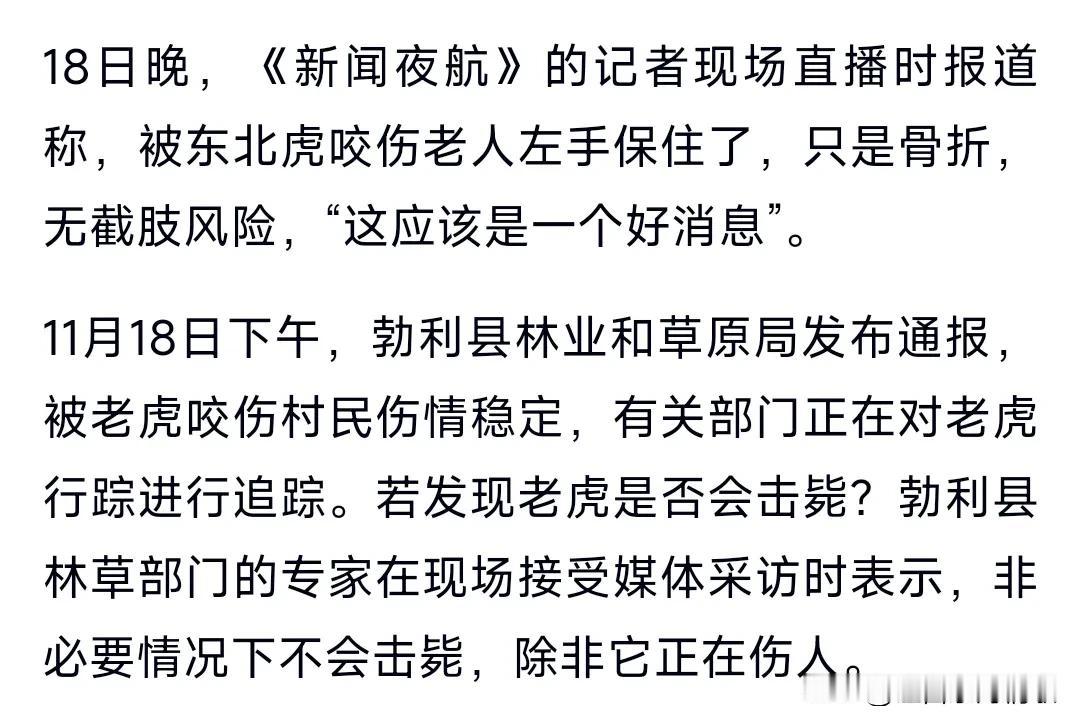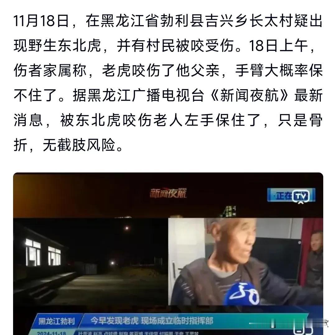 真的是太吓人了,老虎实在是太凶猛了,真的感受到了那种猛虎下山的气势,11月18日,在黑龙江省勃利县吉兴乡长太村疑出现野生东北虎,并有村民被咬受伤。 这位村民的左手被保住了,是骨折,并不用截肢。 这也算是不幸中的万幸了,网传还咬了牛。 有人就提出一个问题,那么发现了这只老虎,会击毙它吗? 有专家回应称,非必要不击毙,除非它正在伤人。 小编也觉得是这个道理,这次支持专家的意见。