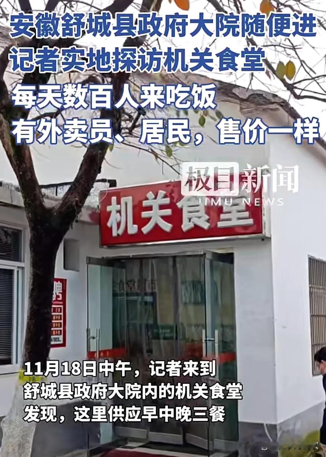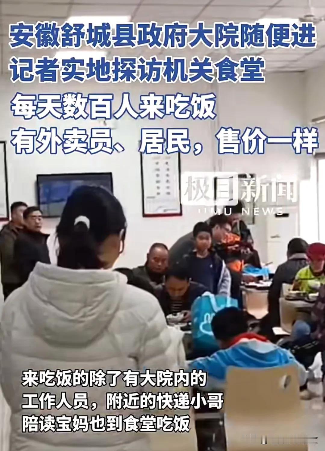 这是我听说过的最接地气和和最有烟火气的县政府和机关食堂,近日,安徽舒城县政府被曝可以免费停车。 不仅如此,这里面的机关食堂老百姓也可以进去吃,也是十分的实惠,很多外卖小哥、宝妈进去吃饭。 每天有数百人到县政府机关食堂吃饭。 吃不完的还可以打包带走,菜品价钱分为两块、4块,7块、10块。 米饭一块钱。 番茄蛋汤免费,这真的是太有生活气息了。 希望这样的食堂永远的开下去。