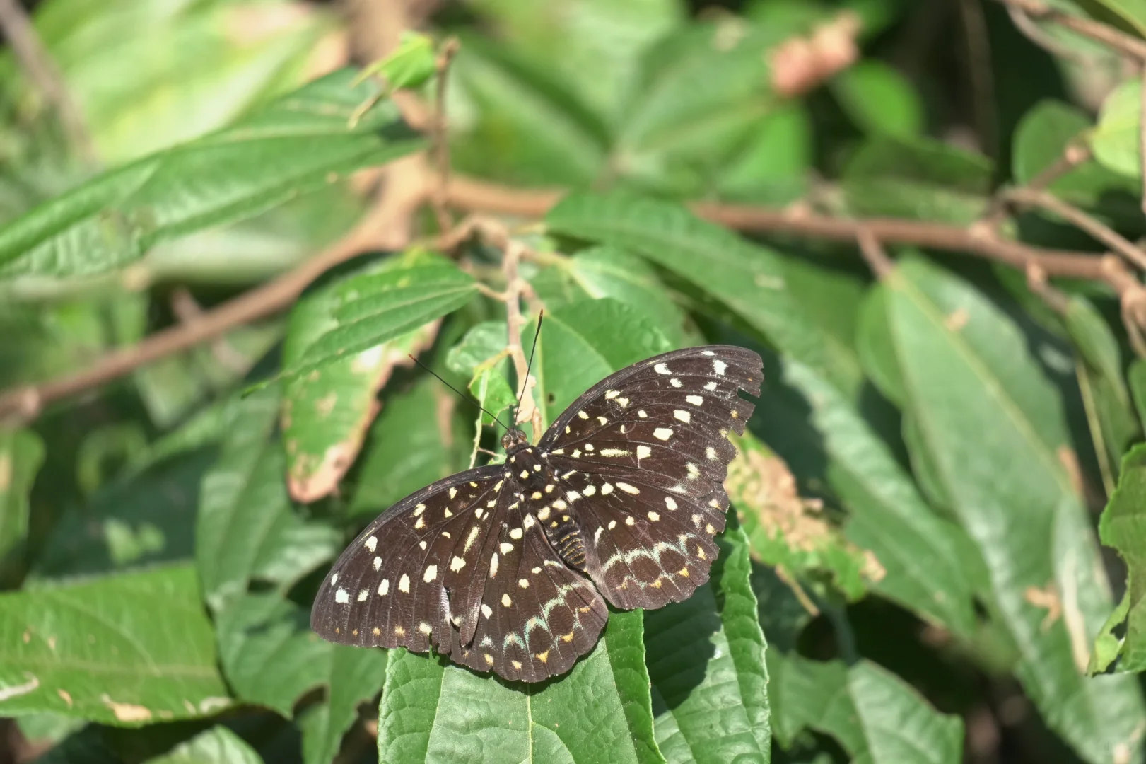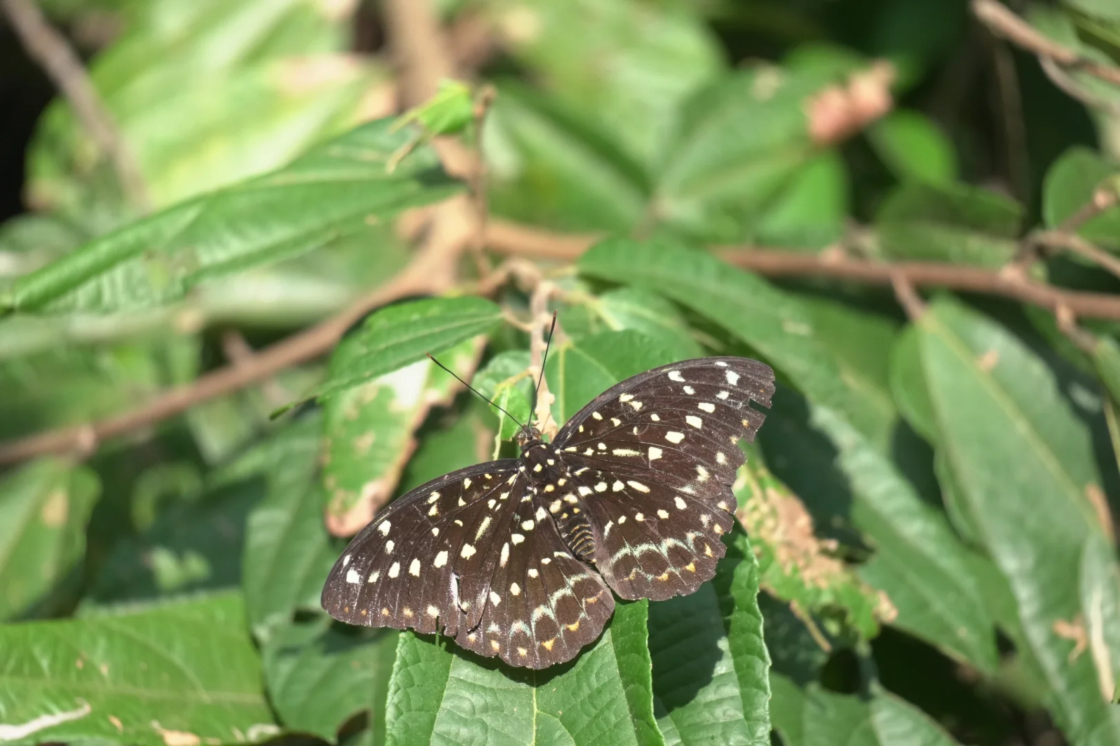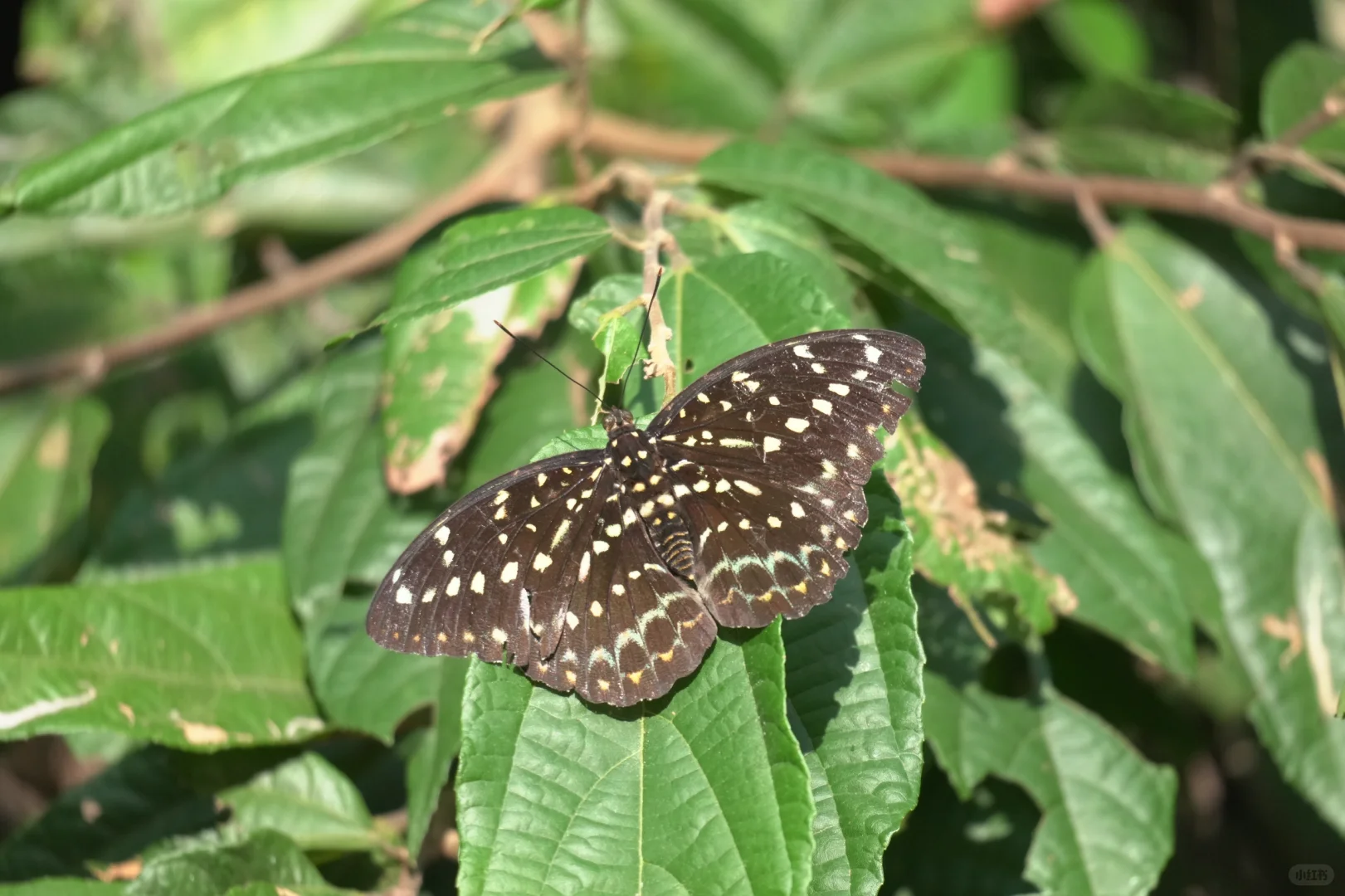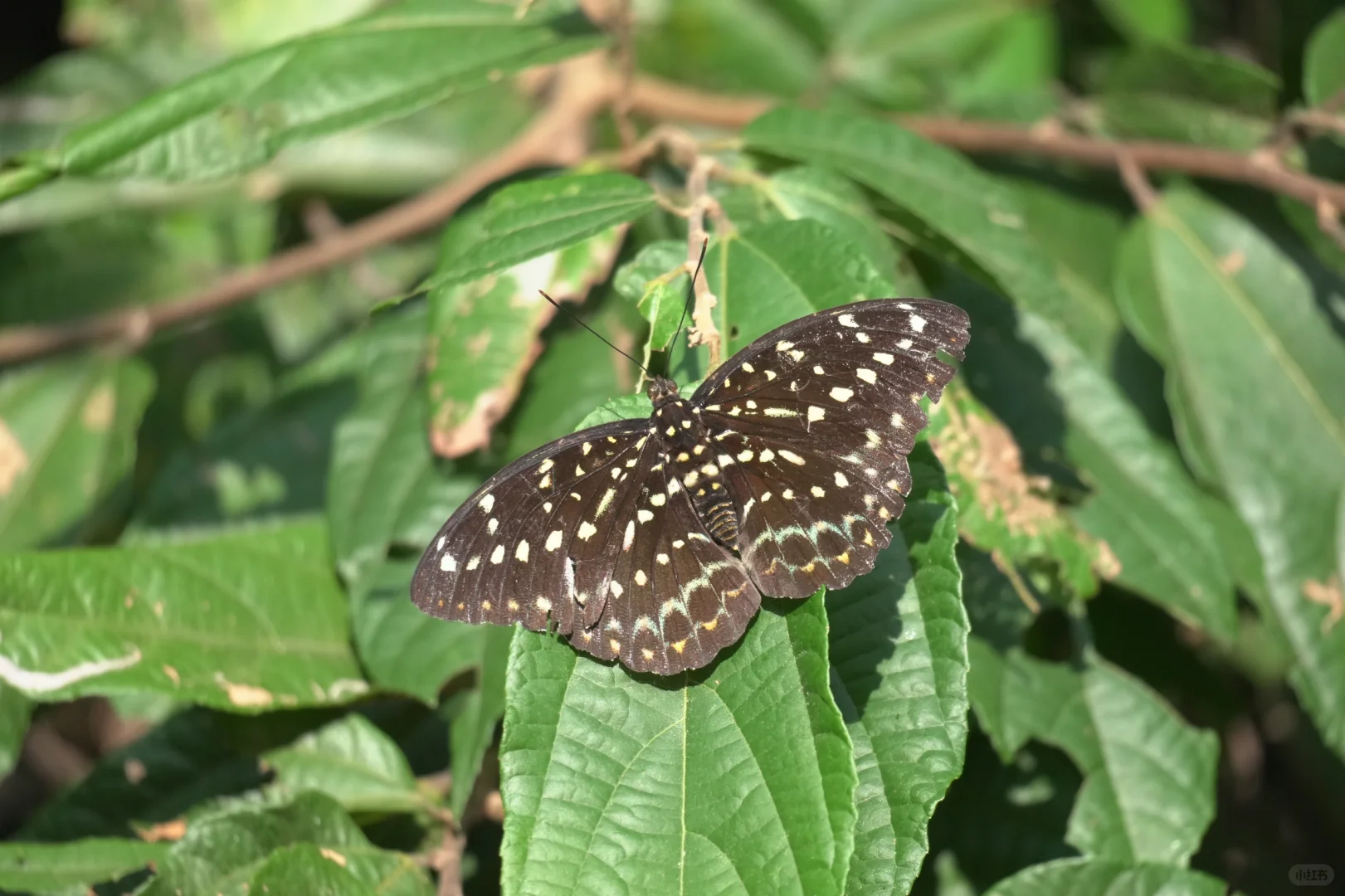 这一次,在园山,我的运气终于来了!🍃 一只优雅的雌蝶停在了面前的枝叶上,安静地休憩着,仿佛知道我们在等待她的惊艳亮相,给足了拍摄的机会。