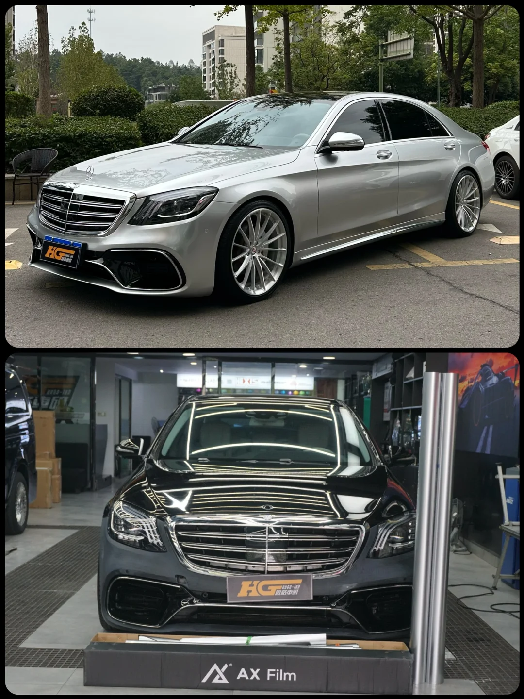 奔驰S320液态金属星瀚银 这台奔驰S也是我们的老客户了,去年贴了Teckwrap的钢琴白,现在颜色看腻了,决定重新换个颜色,这次选择了极具运动性的AX液态金属星瀚银,科技与质感满满