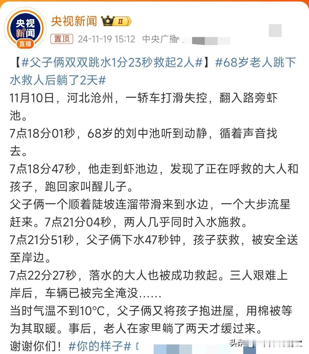 这真的是太英雄壮举了,这家风真的是太棒了,很好的得到了传承,近日,父子俩双双跳水1分23秒救起2人。 11月10日河北沧州,一辆小车因打滑翻入了路边的虾池。 早上7点多,1名68岁的老人听到声音寻声过去,发现这一危险情况,发现大人和孩子在呼救,立马回到家中叫醒儿子。 两人跳下冰冷的水中,将落水的二人救了上来。 大人被救起后,车辆也刚好被水淹没。 当时气温不到10度。 老人立马将孩子带回家中暖身,而救人的老人在家里躺了两天才缓过来。 向这对父子致敬,危难之时显身手,不是一家人不进一家门,见义勇为得到了很好的传承。 建议当地为他们申请见义勇为。