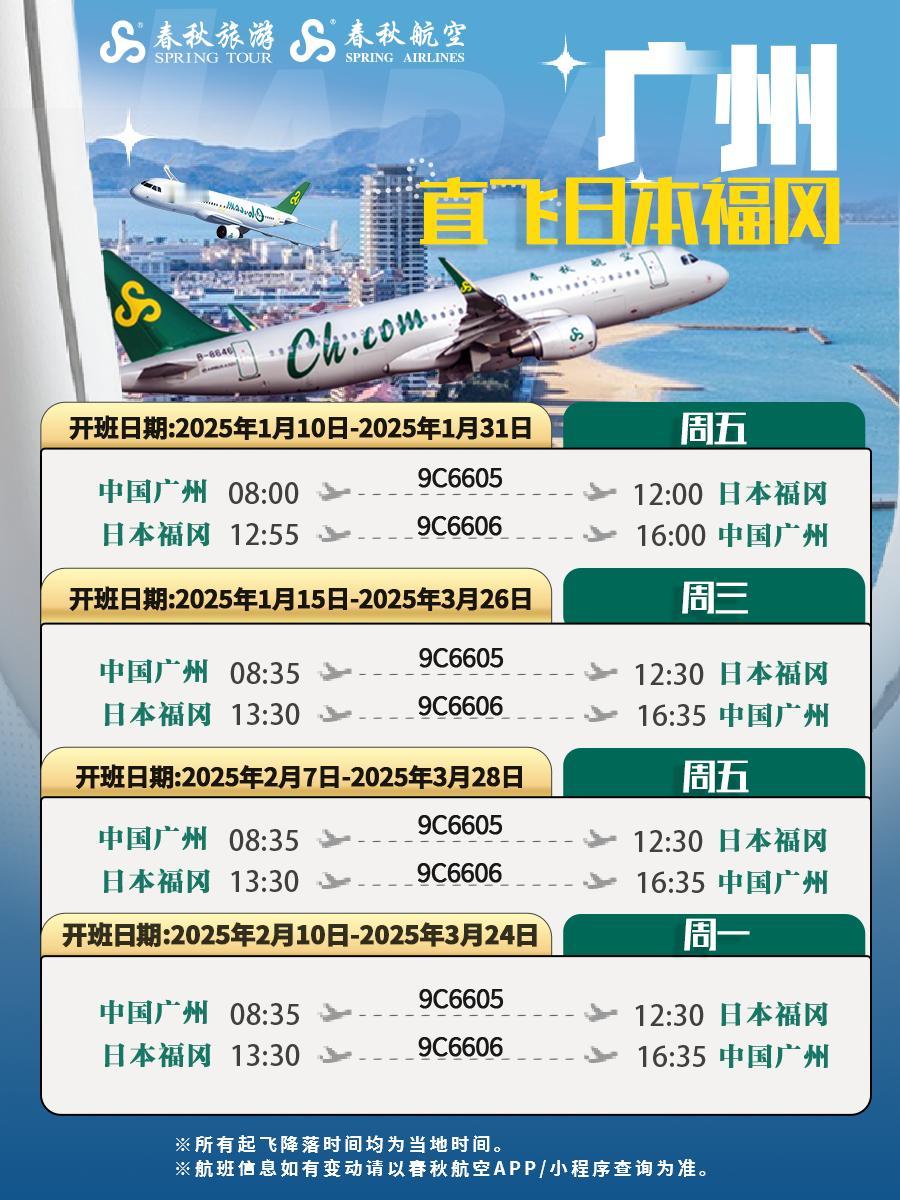 【1月10日起广州新开大阪航线,恢复福冈航线】 明年1月10日起,春秋航空新开广