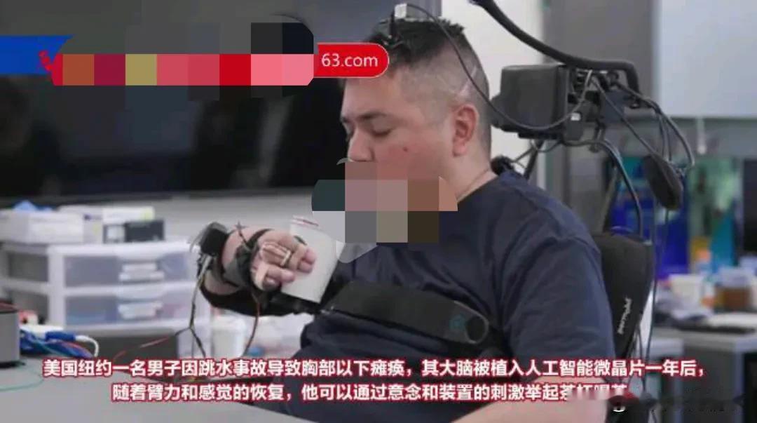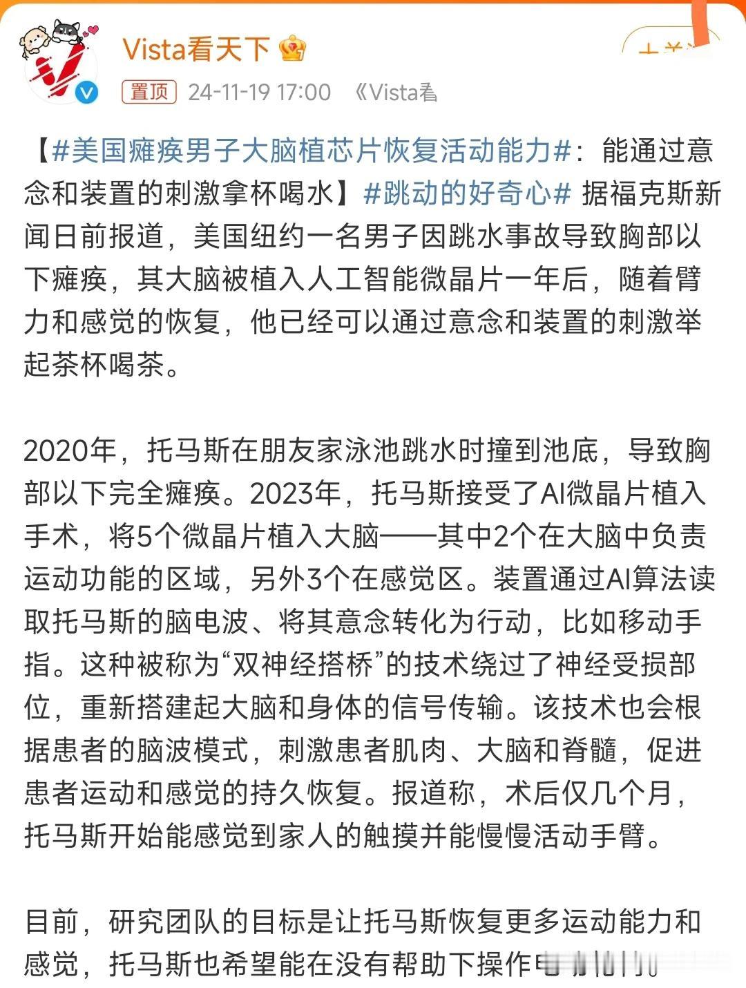 不得不服。 这才是科技改变生活和命运的最佳例子。 网传有媒体报道,11月19日消息,福克斯新闻日前报道,美国一名男子因跳水事故导致瘫痪。 不知道他是怎么个跳法,为什么会造成瘫痪,所以说普通人千万不要胡乱跳水。 他的大脑被植入了人工智能微晶片,植入一年后,已经能靠意念和装置的刺激举起茶杯喝茶。 目前,研究团队的目标是让托马斯恢复更多运动能力和感觉,托马斯也希望能在没有帮助下操作电动轮椅。 也希望科技越来越发达,帮助这些残疾的人。 也希望我们国家能够在这方面能够达到世界领先水平。 科技让生活更美好。