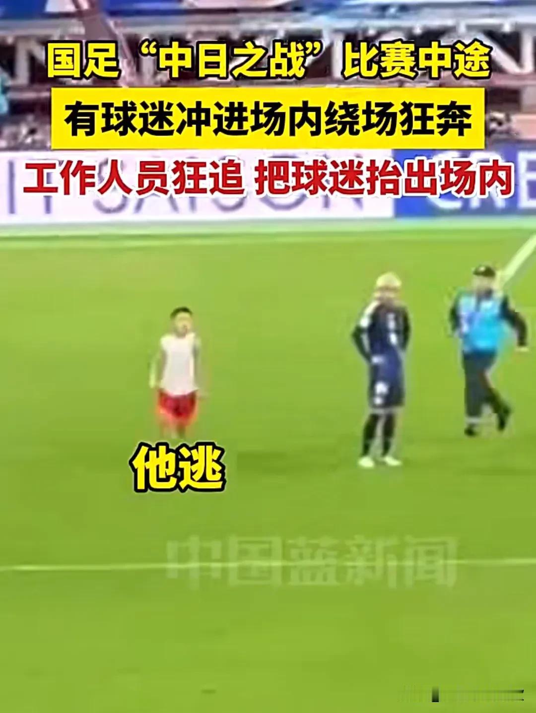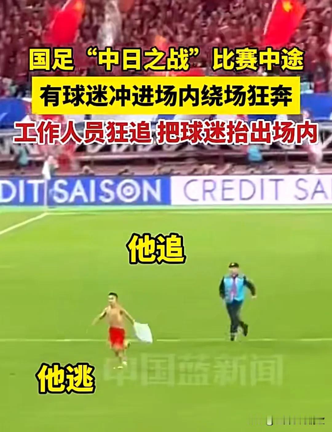 这球迷有点疯狂啊。 11月19日,国足世预赛18强赛中,中国队对战日本队,在比赛现场,有球迷冲进场内绕场狂奔,他张开双臂,用力奔跑,最后还脱掉了上衣,感觉非常的兴奋。 工作人员狂追,把球迷抬出场内,也是不容易啊,非常快速的把此人抬出了场内。 这不是干扰比赛吗? 还是要文明看球。