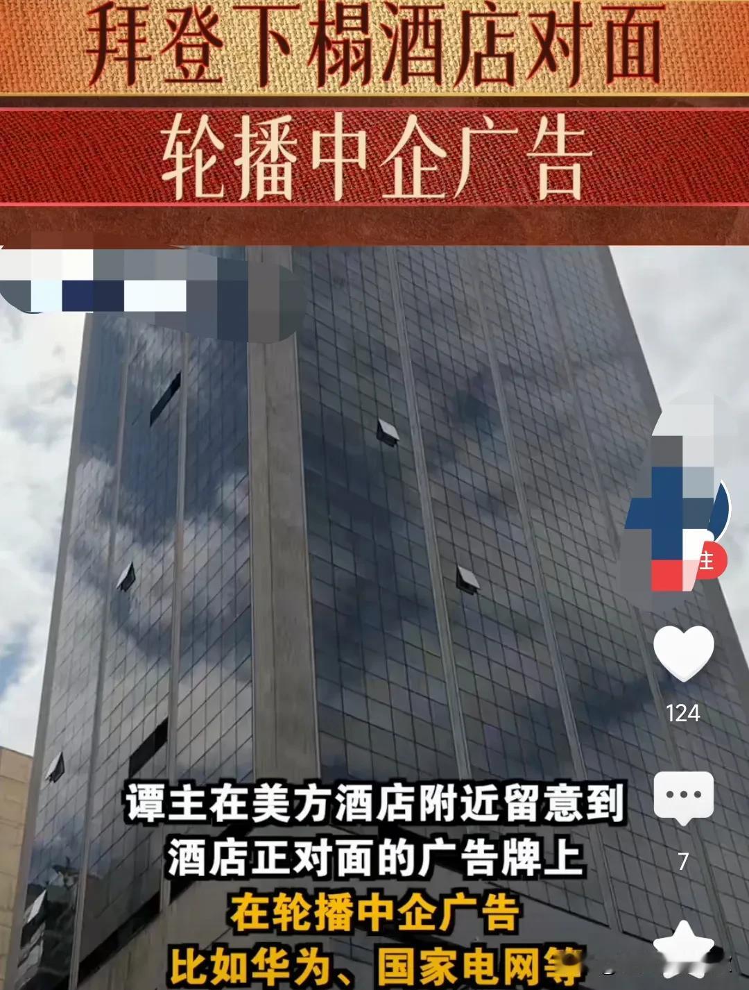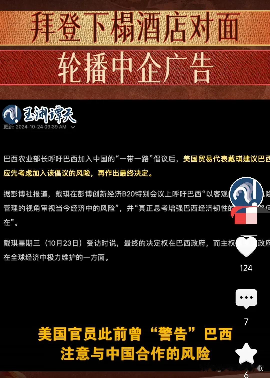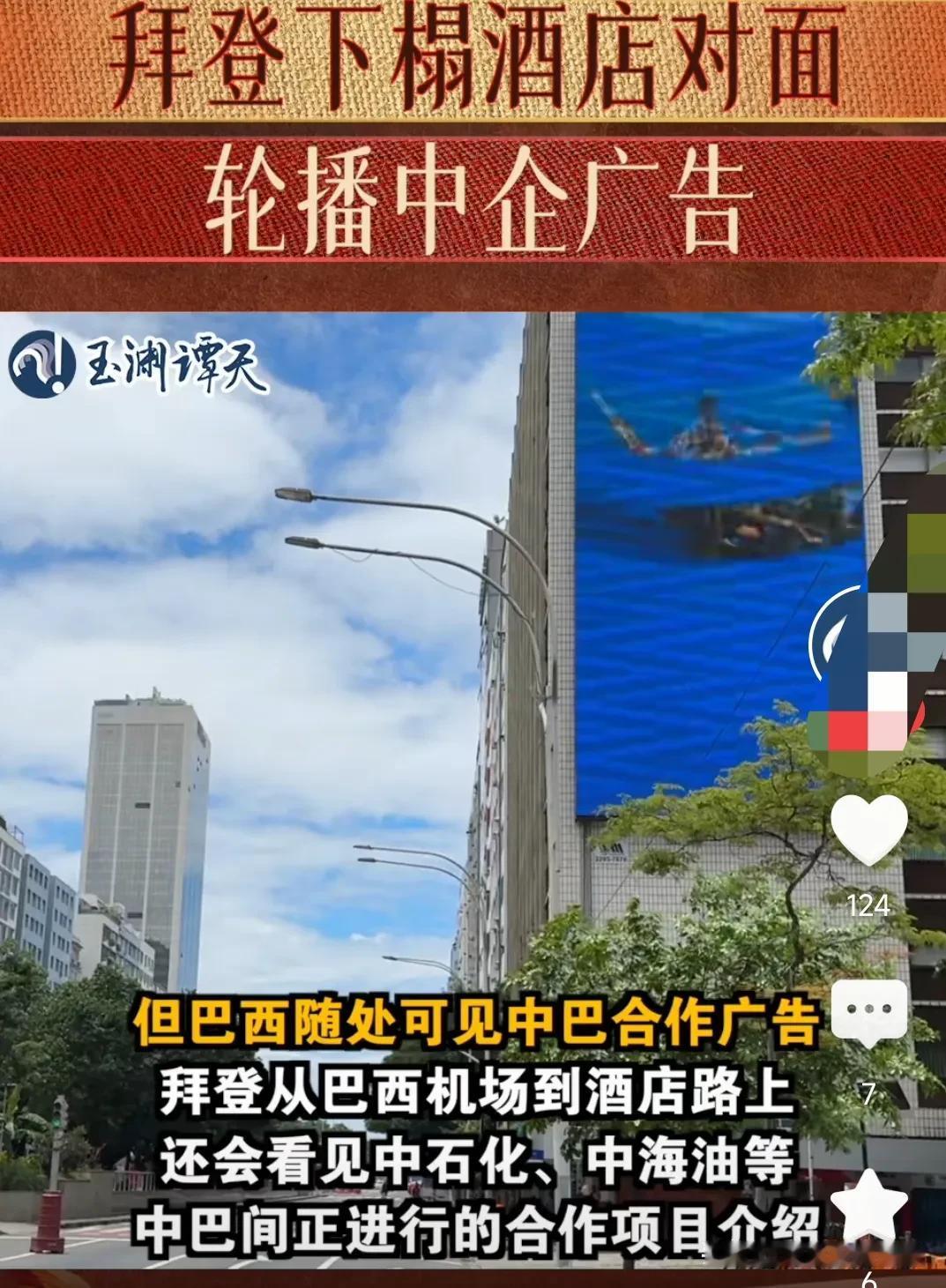 没办法,我们也想低调,但是实力不允许。 拜登下榻酒店对面轮播中企广告,这说明中国的企业在国际上发展的非常的好,就是要保持这种态势。 中国和巴西的合作是民心所向,一带一路的倡议是符合大家共同的利益。 美方也应该不要对中国进行打压,要学会心胸宽广一点,世界大同的理念,才是人类的最终目标。 这次是G20领导人第十九次峰会在巴西举行,拜登也去了,但是下榻的酒店对面轮番播中企广告,希望他会知道这个事情,希望让他明白世界的趋势不可阻挡,历史的脚步永远向前。