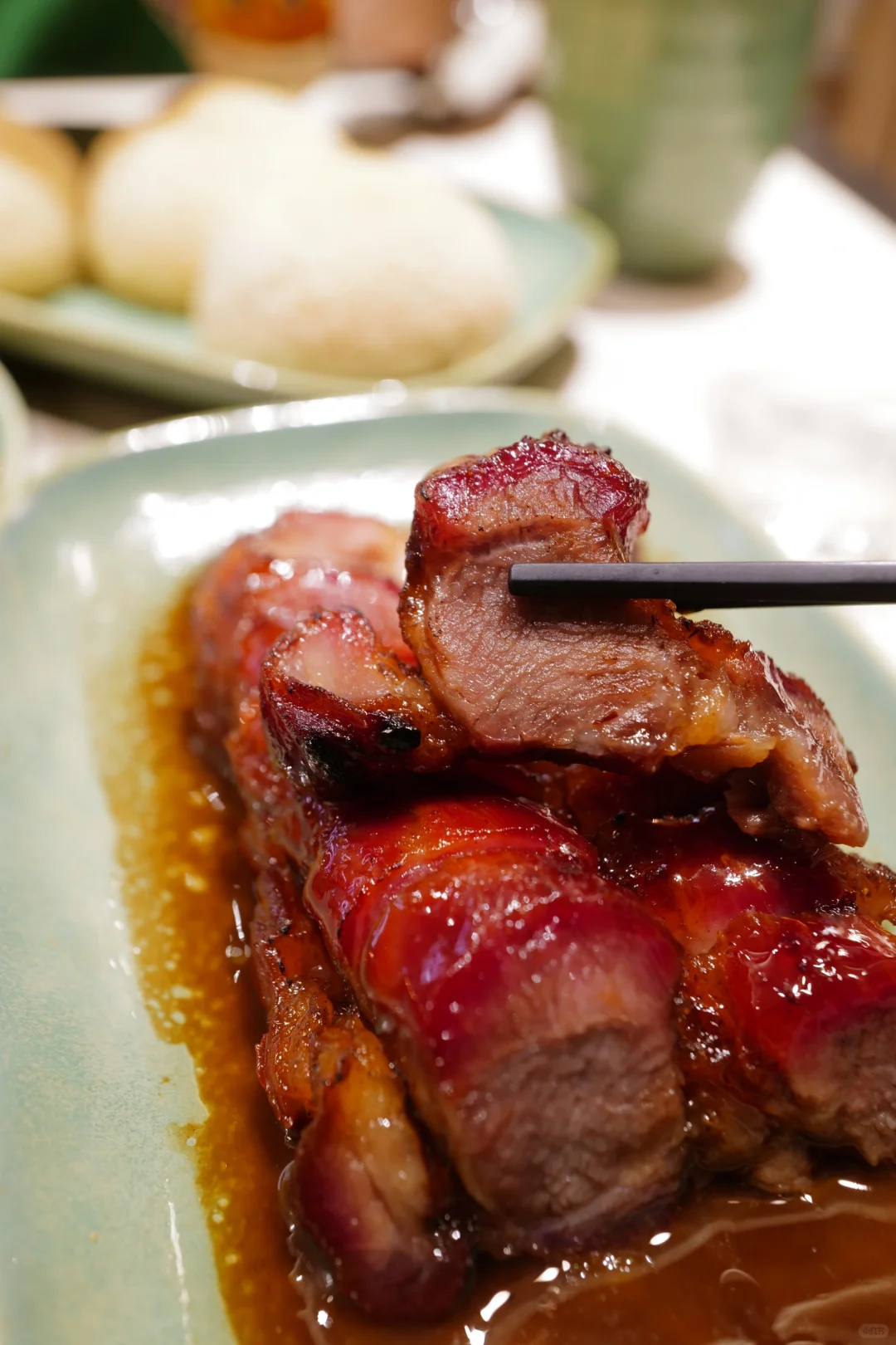 蜜汁叉烧来香港肯定要点的啦,是用级优质脢头猪颈肉腌制,加明火烧制,再涂上麦芽糖,所以口中就是咸甜混合,香而不腻