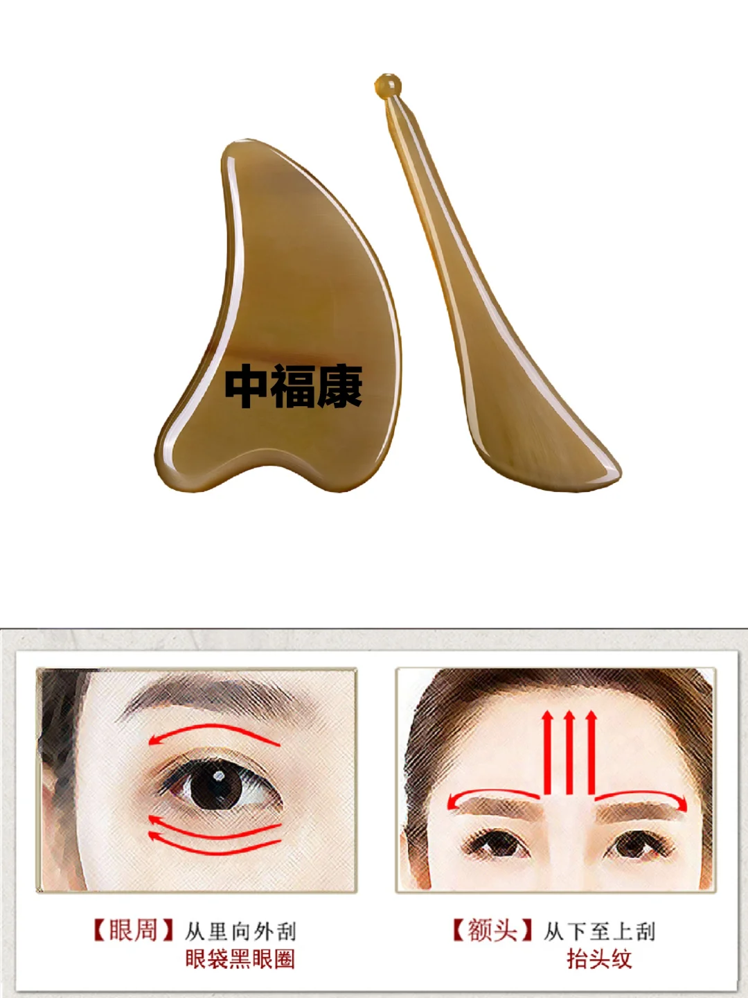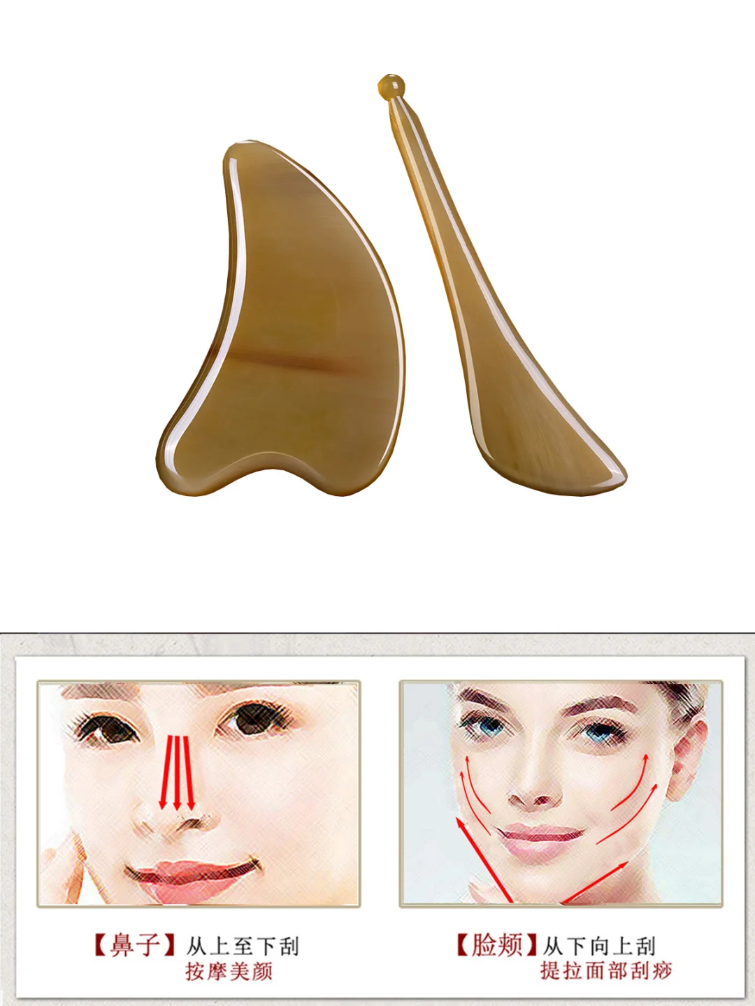 💦💦刮痧板怎么用❓ 🔻🔻🔻角度问题🔻🔻🔻 使用时,板与皮肤呈60°或90°角,刮拭前先涂抹介质,以施术部位为中心,向外周扩大范围 🔻🔻🔻拿刮板方法🔻🔻🔻 手握刮沙板,想出痧快用薄边,想出痧慢用厚边 🔻🔻🔻方向问题🔻🔻🔻 面部:由下往上,有里往外; 颈、背、腹、上肢、下肢部从上向下刮试,胸部从内向外刮试。 🔻🔻🔻补刮与泻刮是什么🔻🔻🔻 顺着经络的走行进行刮,即为补刮 逆着经络的走行进行刮试即为泻刮 🔻🔻🔻时间🔻🔻🔻 用泻刮或平补平泻手法进行刮痧,一个部位3-5分钟; 用补刮手法,一个部位5-10分钟。 对于健保刮痧无严格的时间限制,以自我感觉满意、舒服为原则。 ✨✨刮痧需要坚持,漂亮需要恒久 - 💦💦面部刮痧板使用的益处 ①、刺激性外皮末梢神经 ✅提高其传输作用的功效,激话损伤的枯、弱体细🔄胞 ✅推动和修复体细胞本身的代谢、再造和清理作用 ✅加快新陈代谢物质从皮肤汗孔排出来,毛孔清洁。 ②、舒筋活络,祛斑美白,活络化瘀,身体去毒抗氧 ✅脸部刮痧,准确发现经络淤阻的位置, ✅消除阳性反应,如:皮肤发冷、发热、有涩感、皮下组织发觉沙乐样、包块样组织,疼痛、肌肉紧张、肌肉僵硬、疲软等都归属于阳性反应 ✅能够迅速输通经络,活络化瘀 ✅改善肌肤浅层循环,使皮肤新陈代谢废弃物从血液循环系统的方式快速清除, ✅改进面色,变黯淡为白里透红 ✅为皮肤净白,合理消除、淡化老年斑 - 💦💦刮痧板、拨筋棒常用形状: 1、V形(桃心板、小海豚) (常用)✅ 2、长方形 3、S形 4、扇形 5、逗号形 6、扇形拨筋棒✅(常用) 7、球拍拨筋棒 - 牛角刮痧板,拨筋棒,梳子 天然产品,每个都不一样