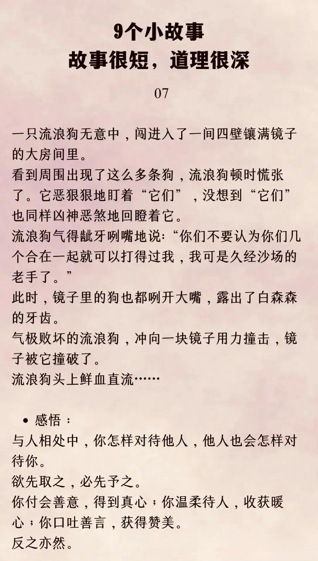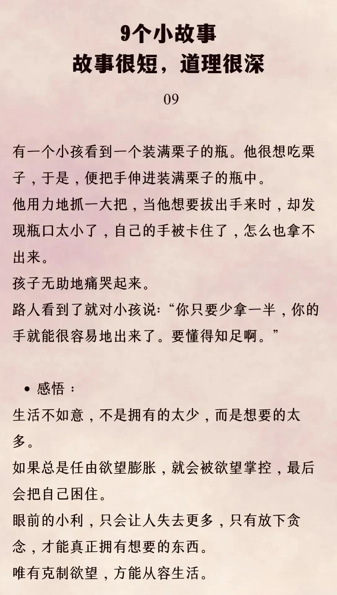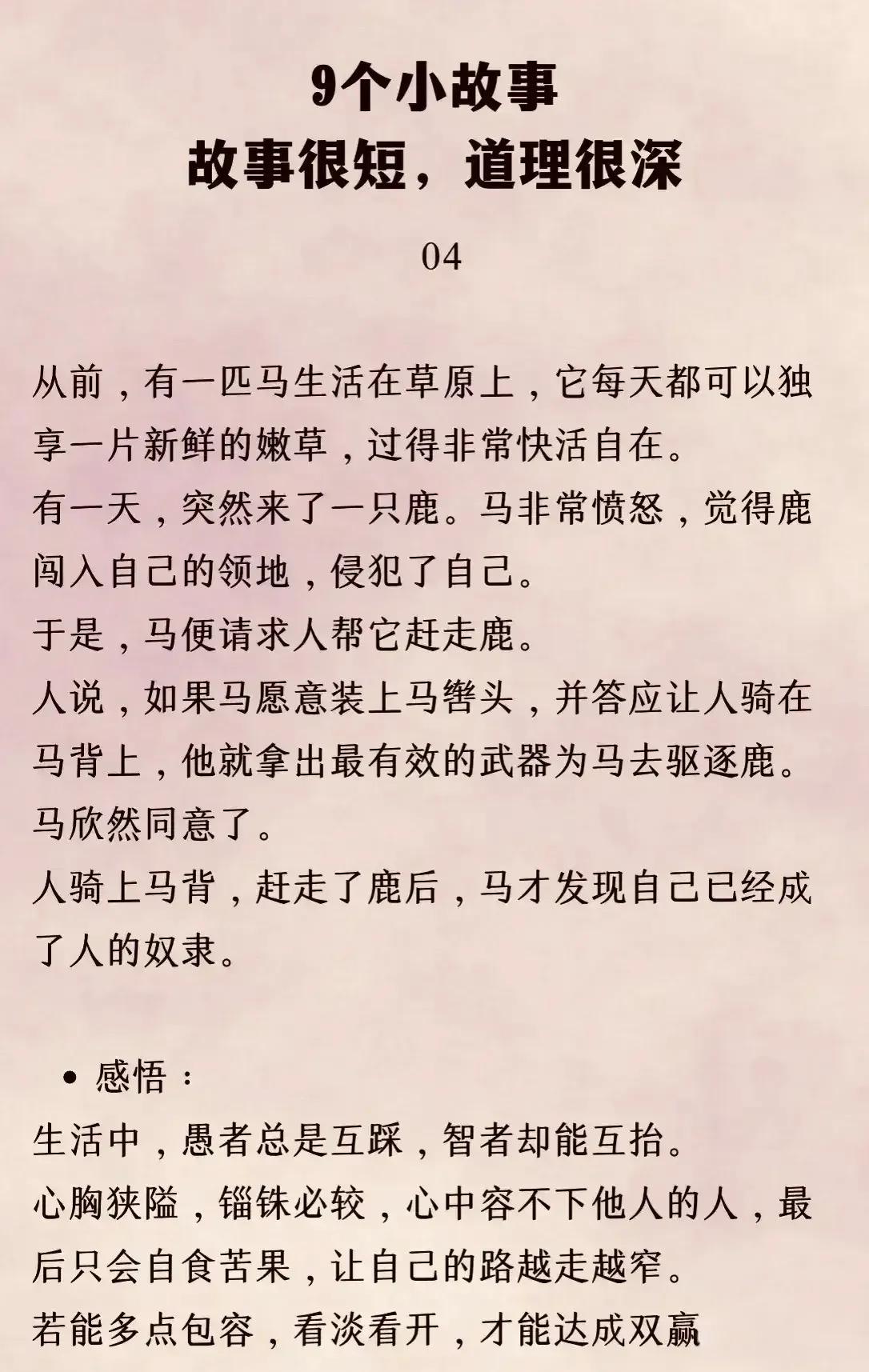 九个小故事,一个故事一个道理,孩子容易接受和理解,家长闲暇的时候,一定要多跟孩子讲一讲小故事,千万别再把时间献给了无知! 比如,第二小故事,乌鸦和鸽子是好朋友,它们一起住在森林里乌鸦觉得大家都不喜欢自己,所以决定离开这片森林。 乌鸦去跟鸽子告别,它伤心地告诉鸽子:“在这里大家都嫌弃我,嫌我声音太难听了,我实在呆不下去了,其实我也不想离开的。鸽子听后,想了想说:“如果你不改变自己的声音,无论你飞到哪都不会受欢迎的。 这个故事告诉我们:一个人成熟的标志,是懂得向内归因遇事不责备,犯错不推脱,才能更好地提升自 【小故事大道理】
