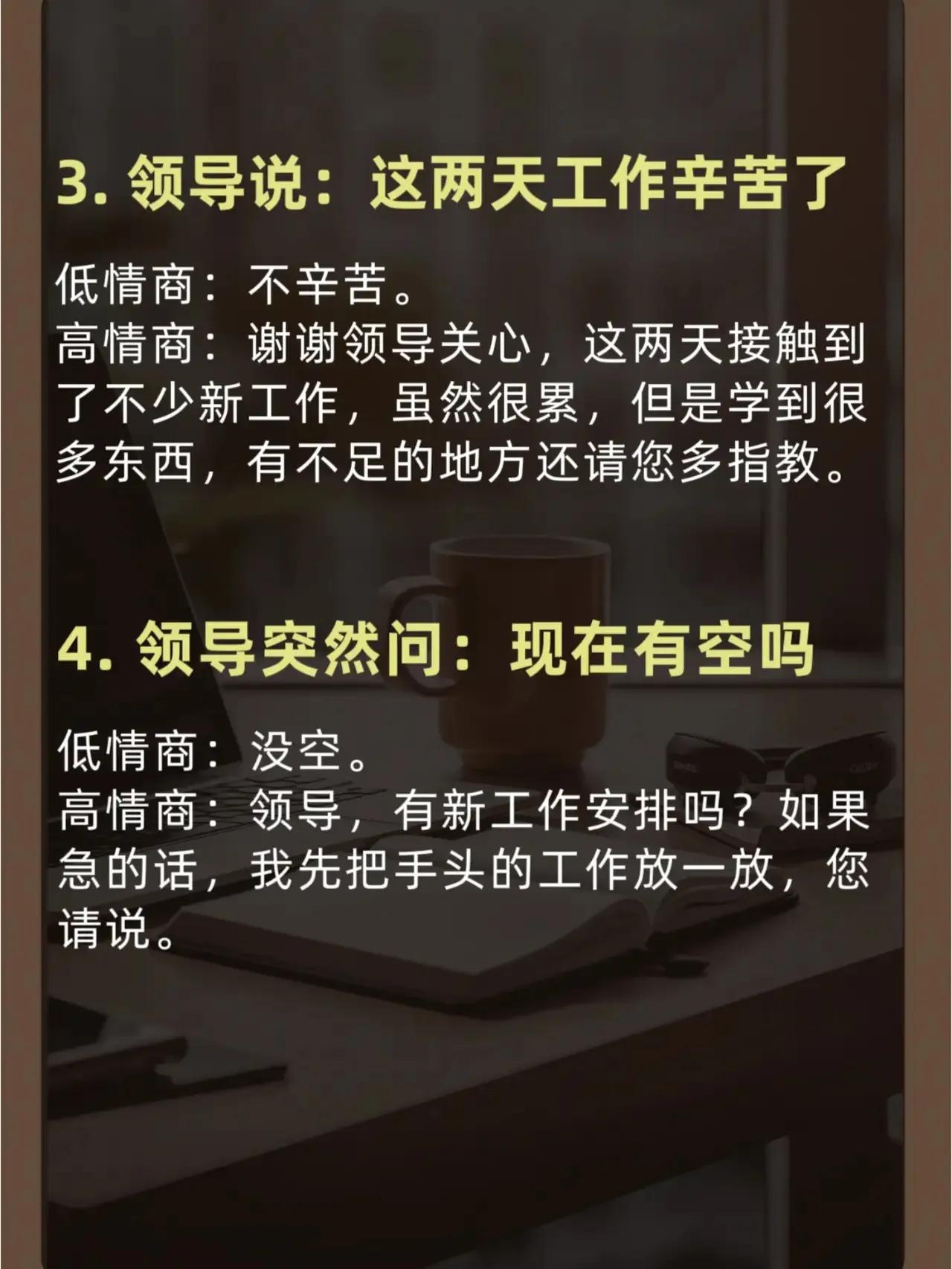 让领导爽死的聊天话术!看低情商和高情商是怎么回话的。 比如领导问你:在不在 低情商:在的/领导您找我有什么事/怎么了? 高情商:在的,领导您有什么安排吗? 领导跟你说:谢谢 低情商:不用谢。 高情商:领导您客气了,您先忙,有问题随时找我。 领导说:这两天工作辛苦了 低情商:不辛苦。 高情商:谢谢领导关心,这两天接触到了不少新工作,虽然很累,但是学到很多东西,有不足的地方还请您多指教。 领导突然问:现在有空吗? 低情商:没空。 高情商:领导,有新工作安排吗?如果急的话我先把手头的工作放一放,您请说。 简直被惊到了,差距原来是如此之大!学到就是赚到,领导听了直呼哇塞,助你在职场如鱼得水,步步高升。 高情商聊天术