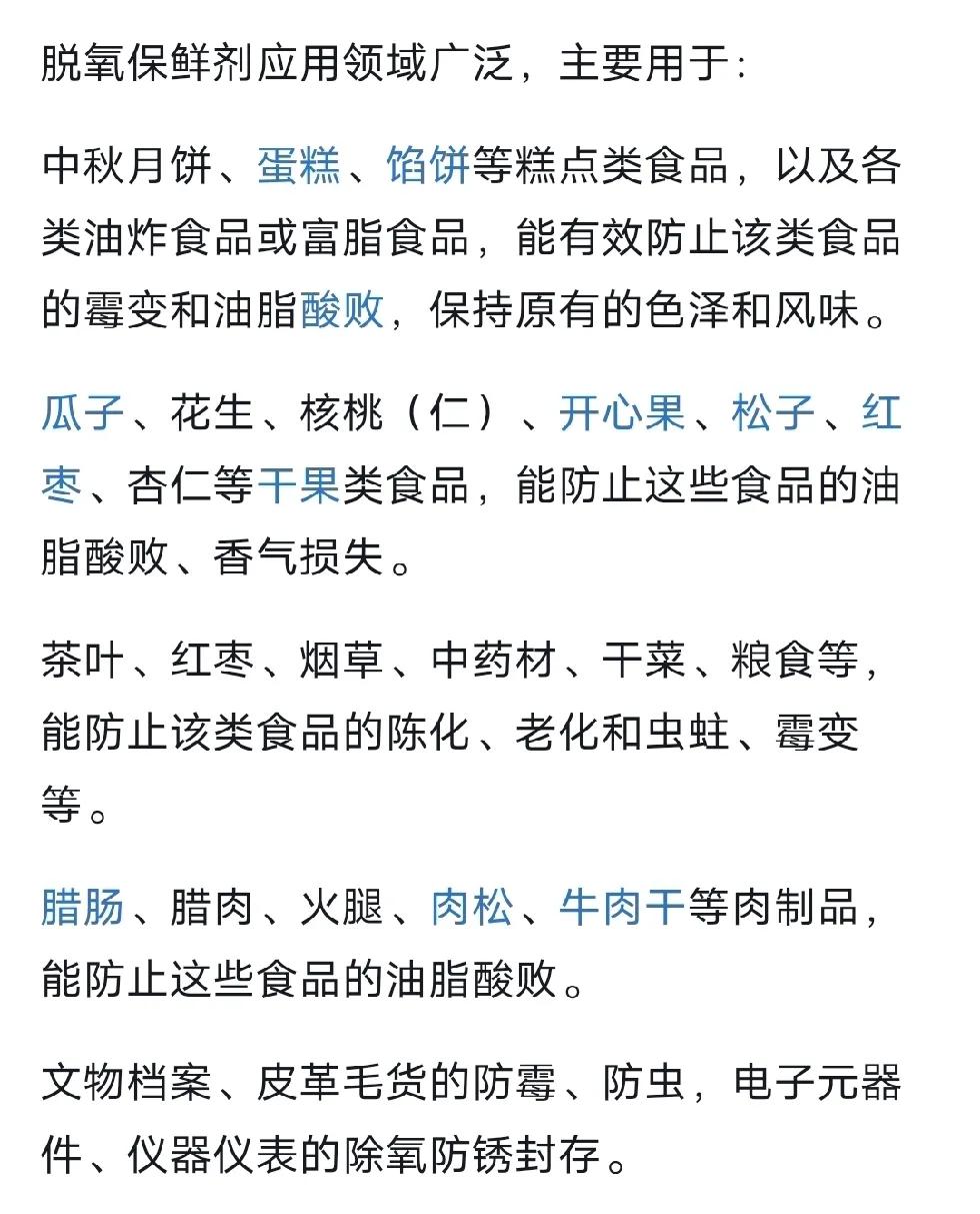 食品袋里掉出来一袋,看着还挺好看的东西。仔细一看,哦,是保鲜剂。查了一下用途,还真的很广泛。有时候我在想,为什么现在社会癌症越来越多了。会不会跟我们吃的这些预包装的零食有关呢?虽然这些包装都有保鲜剂,但保鲜剂就一定能保证新鲜吗?还有我们的冰箱普及了,但冰箱里的东西,就保证不会坏吗? 尤其现在冰箱越来越大,三开门,好多塞满的冰箱,可能几个月都没办法循环一次。也就是说,有的东西可能被放一年半载也是有的。 尤其现在工作时间的延长,加班的常态。让人们失去了生活的意义。只有生,没有活动。没有时间做早饭,中饭,晚饭。没有时间陪家人一起,轻松的做饭吃饭聊天。 真的希望预制零食,能够减少保质期,很多写着一年,甚至更久。真的能保持那么久吗?火腿肠放一年,吃着还健康吗?还有那些预制菜。这个不否定。但是,再怎么预制,我觉得保质期一周,两周,就很久了。可别弄个一年半载的。我们都不提倡吃隔夜菜。预制菜放久了,怎么就能好。尤其这个节奏异常快的时候,很多懒人就依靠预制品生存,应该做一做调查,预制品吃多了,年头久了,对身体到底有没有害处。这才是社会最最需要了解的。