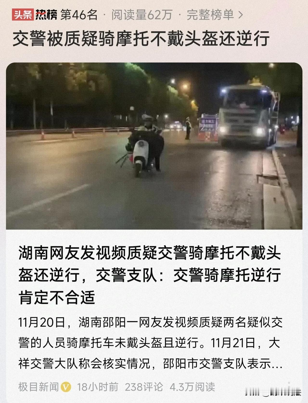 可以处罚吗?湖南,网友看到两名身着制服的男子,骑摩托车没戴头盔并逆行,且疑似交警,于是提出质疑,他们这样合不合法?没想交警部门的工作人员回应,“交警骑摩托车逆行肯定不合适。”网友表示不服,“啥叫不合适?难道没有违法?” (来源:极目新闻) 一辆大型货运车停靠在路旁,前方是施工提示牌,一名身着交警制服的工作人员站在道路中间。 就在这时,两名疑似身着交警制服,反光背心的工作人员驾驶摩托车出现在画面中,两人均未戴头盔,而是白色大檐帽,坐在后排的工作人员手上还举着疑似测速仪的设备。 视频拍摄得非常清晰,且视频有画外音,“交警不戴头盔,天天喊我们戴头盔?” 发视频的网友表示,“今晚看到两位穿制服的同志没戴头盔还逆向行驶,不知道是不是交警部门的同志。我们得遵守法律讲文明呢。” 目前,视频发布者已删除该视频。 交警支队的工作人员回复说,“交警骑摩托车逆行、不戴头盔肯定不合适,网传视频中的问题听说是宣传科在处理。” 事发后,网友提出了几个疑问: 第一,骑的是小毛驴,还是摩托车;第二,没戴头盔怎么处罚?第三,只是不合适吗?为什么不是违法? 1、交通法规明确了电动车载人的相关规定。 成年人驾驶自行车、电动自行车,在确保安全的前提下,在城市道路上可以载一名12周岁以下未成年人,在其他道路上载人不得超过一人。 未成年人驾驶自行车不得载人。 《湖南省电动自行车管理办法》规定,电动车严禁搭载12周岁以上人员,违者处罚款50元。 该“摩托车”上有两个人,后排男子的年纪肯定不止12周岁,所以如果是电动车的话,这样的行为已经违法了。 2、骑摩托车不戴头盔,应该怎么处罚? 摩托车属于机动车,骑摩托车不戴头盔的,《道路交通安全法》第九十条规定,机动车驾驶人违反道路交通安全法律、法规关于道路通行规定的,处警告或者二十元以上二百元以下罚款。 也就是说,驾驶摩托车不戴头盔,将受到记2分,罚款200元的处罚。 为了自己和他人的安全,疑似交警的两名男子在驾驶摩托车时,请一定佩戴好安全头盔,也让后座乘坐人员佩戴安全头盔,并安全行驶。 3、骑摩托车逆行只是不合适吗? 《道路交通安全法》第九十条,机动车驾驶人违反道路交通安全法律、法规关于道路通行规定的,处警告或者二十元以上二百元以下罚款。本法另有规定的,依照规定处罚。 交通管理部门对于逆向行驶行为严格打击,如果驾驶人有逆向行驶的交通违章行为,则处以驾驶人200元违章罚款,驾驶证扣3分。 如果驾驶人在高速公路上逆向行驶,则处以驾驶人200元罚款,驾驶证一次扣12分。 具体到本案,两名身穿制服的男子,骑摩托车逆行,违反道路交通安全法律法规关于道路通行规定,属于违法行为,而不是什么不合适。 4、两名身穿制服的男子,若是交警,他们的行为无疑造成了极其恶劣的影响。 《公职人员处分法》第四十一条,公职人员有其他违法行为,影响公职人员形象,损害国家和人民利益的,可以根据情节轻重给予相应政务处分。 法律面前人人平等,交警身为执法者,更应该以身作则,遵纪守法,一边要老百姓戴头盔,遵守交通规则,一边自己不戴,如何让老百姓信服? 最后,交警骑摩托不戴头盔逆行,不是不合适的问题,而是知法犯法, 罪加一等。 希望当地有关部门可以依法依规对涉事人员进行严惩,不能轻飘飘的一句“肯定不合适”就完了。 交警被质疑骑摩托不戴头盔还逆行 关注@蚂蚁说法 关注时事新闻和法律