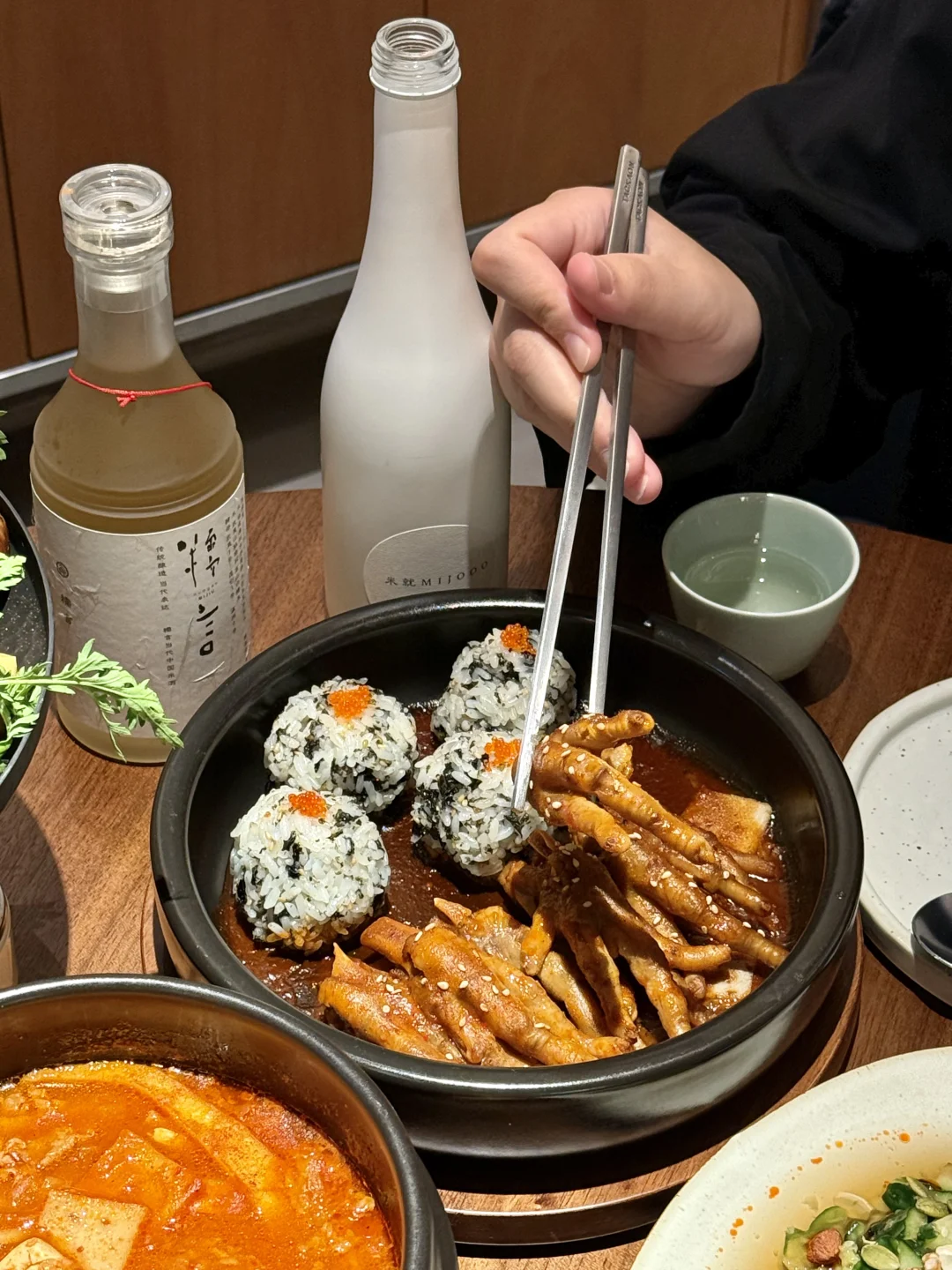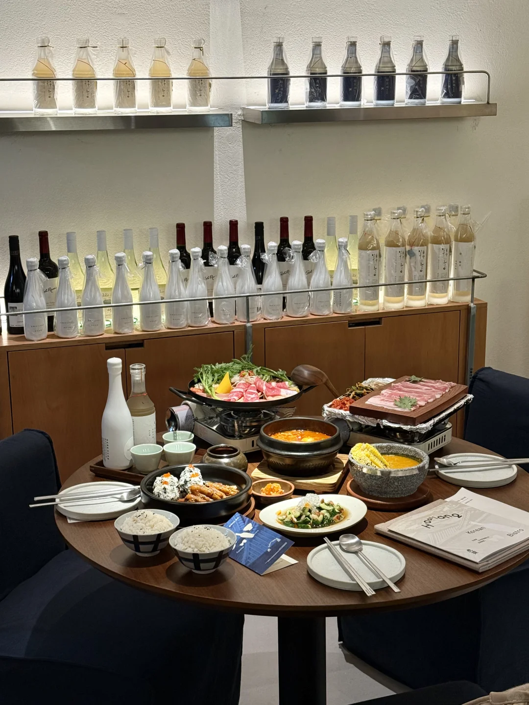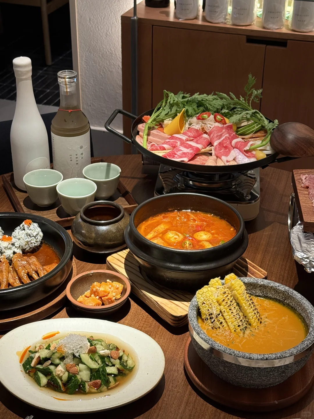 武汉新开的韩系小屋🫧 吃到了好多韩剧同款🇰🇷 - 🥩一份烤的滋啦啦的冷三肉 一道下酒小菜🥢 🍶再来一杯米其林同款米酒 他家酒是女孩子也能嚯的小甜水 微醺但不上头我超爱😆 口感层次很丰富 还有淡淡的梨子白桃果香 - 最后来一份泡菜汤和热呼呼的部队火锅🍲 冬日的第一顿韩料🍖吃的很满足!