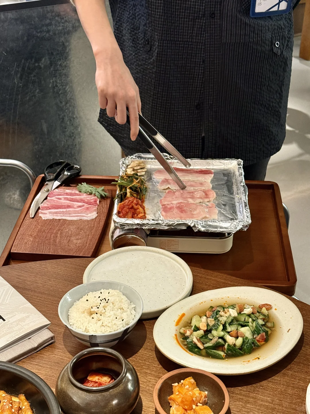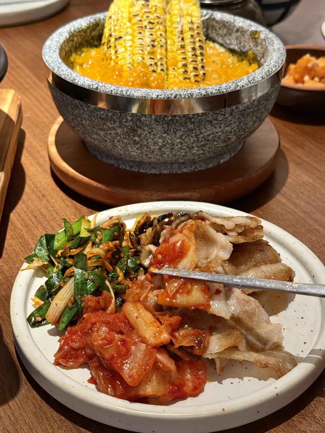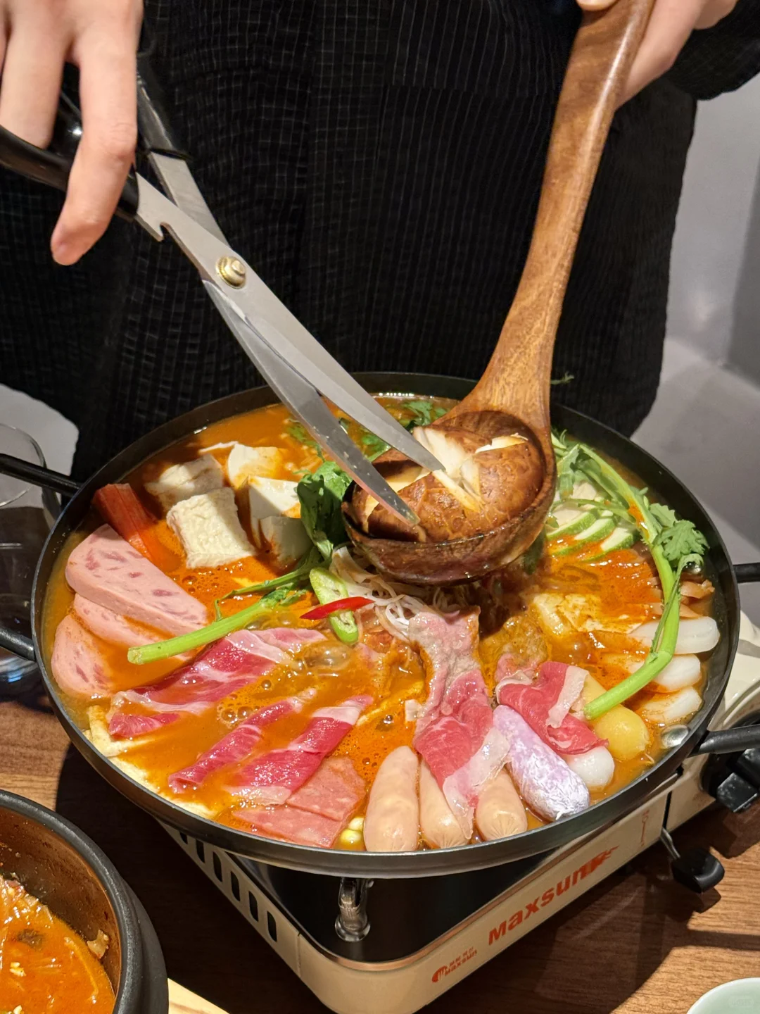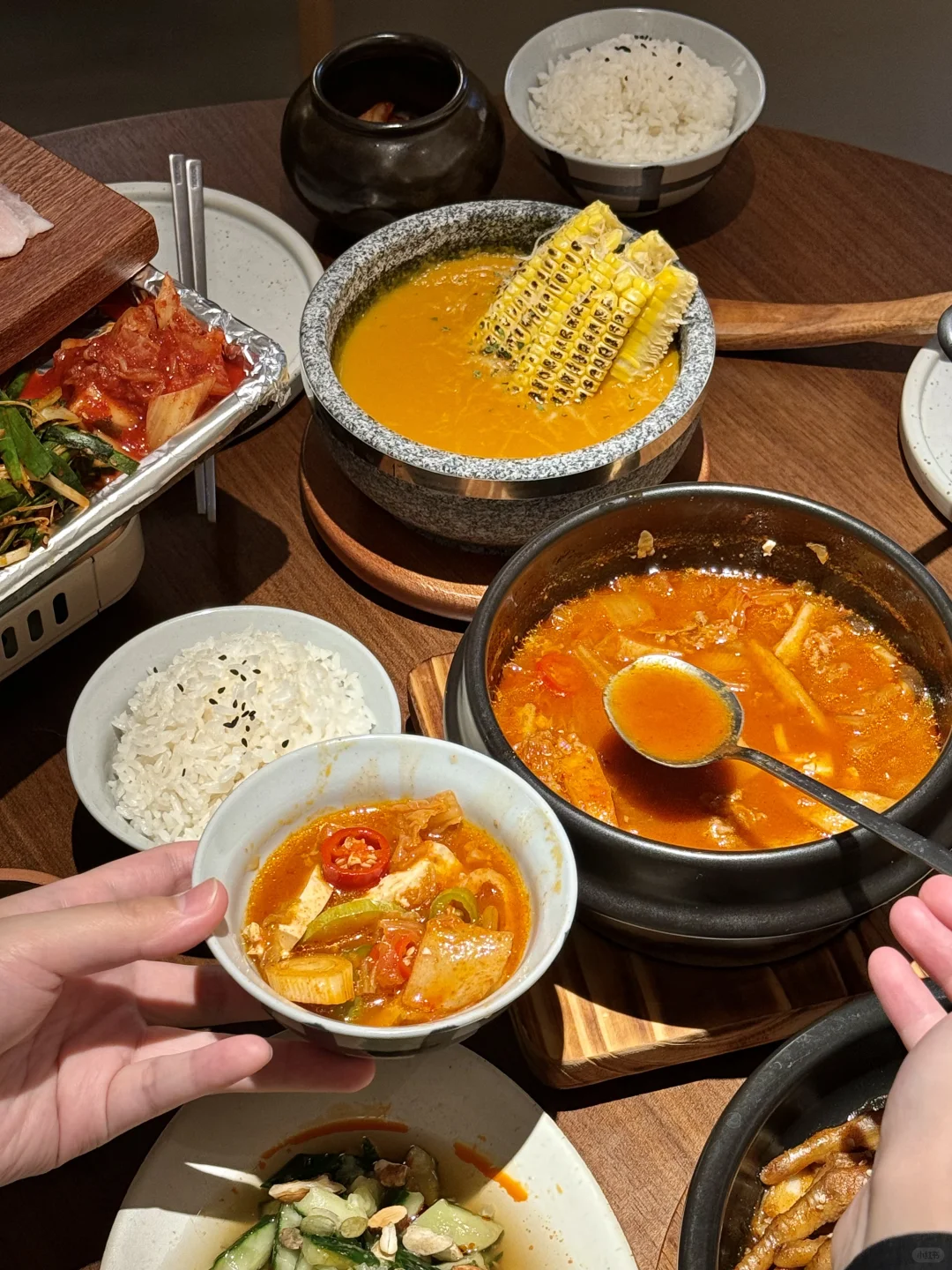 武汉新开的韩系小屋🫧 吃到了好多韩剧同款🇰🇷 - 🥩一份烤的滋啦啦的冷三肉 一道下酒小菜🥢 🍶再来一杯米其林同款米酒 他家酒是女孩子也能嚯的小甜水 微醺但不上头我超爱😆 口感层次很丰富 还有淡淡的梨子白桃果香 - 最后来一份泡菜汤和热呼呼的部队火锅🍲 冬日的第一顿韩料🍖吃的很满足!