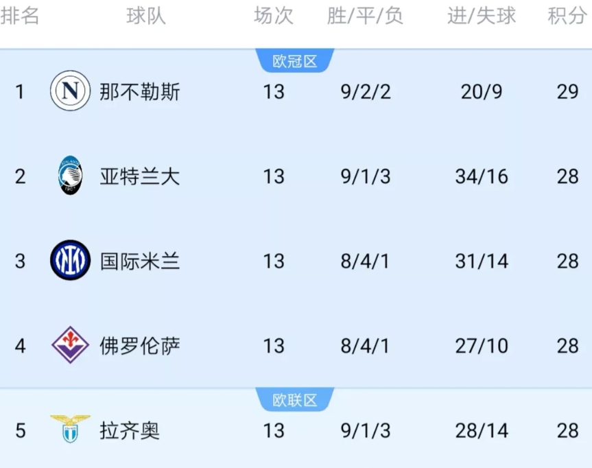 意甲群雄逐鹿,那不勒斯29分领跑,亚特兰大、国米、佛罗伦萨、拉齐奥28分紧随其后,尤文25分虎视眈眈,本赛季意甲百花齐放争冠悬念要保留到最后了。