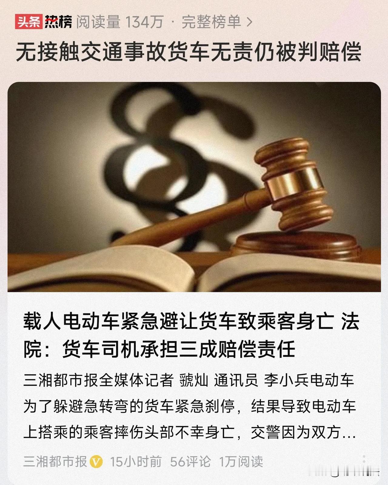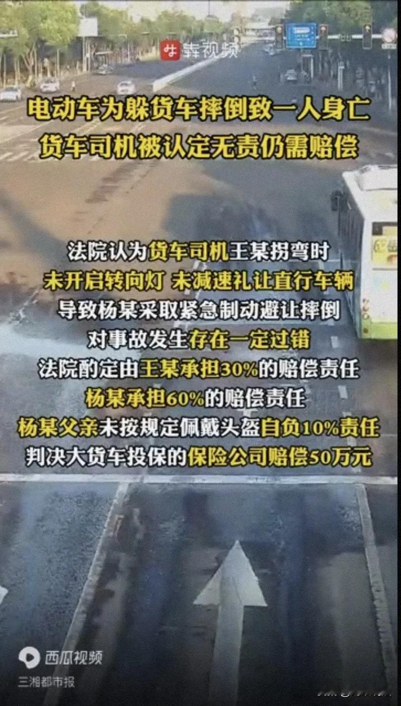 湖南,男子骑电动车载父亲行驶至某路口时,看到前方的货车在急转弯,于是来了个紧急刹停,谁曾想到,连人带车摔倒在地,父亲更是头部受伤,不幸身亡。事发后,交警因为双方没有接触判定电动车司机全责,男子不服,起诉到法院,网友认为法院的判决合情合理。 (来源:三湘都市报) 杨昌云原本准备骑着车直接冲过去,但看到货车气势汹汹的架势,意识到强行冲过去可能会出事,于是又改变策略,来了个紧急刹停。 或许是因为太过仓促,连人带车砰的一声,摔倒在地上。 如果电动车上只有杨昌云(化名)一人,倒也没事,可能就一点软组织擦伤,但当天杨昌云骑电动车载父亲出门办事,父亲头的直接磕到地上。 杨昌云表示,那是十字路口,过马路时他已习惯性地放慢了车速。可突然之间,一台大货车从右侧急速驶出。 杨昌云瞪大了眼睛,本能地捏紧了刹车,然而电动车在巨大的惯性作用下,瞬间失去平衡,摔倒在地。 父亲被这突如其来的变故吓了一跳,下意识地伸出双手保护自己。杨昌云则紧紧抓住电动车的把手,试图稳住车身。 一切都在电光石火之间,两人最终还是重重地摔倒在地。 相比于杨昌云,父亲摔倒了头部, 大货车司机见状,赶紧刹车,下车查看情况。杨昌云更是顾不上疼痛,挣扎着爬起来,查看父亲的伤势。 然而,父亲摔到了头部,120将父亲送到医院抢救,经抢救无效死亡。 1、交警出具事故认定书,认定杨昌云一方全责,货车一方没有责任。 交警调查显示: 该路口无信号灯,货车通过路口右拐弯时,没有打转向灯,也没有减速让行,保持快速行驶状态。杨昌云父亲没有佩戴头盔。 《道路交通事故处理程序规定》第六十二条,公安机关交通管理部门应当自现场调查之日起十日内制作道路交通事故认定书。对需要进行检验、鉴定的,应当在检验报告、鉴定意见确定之日起五日内制作道路交通事故认定书。 事发后,交警部门在规定的时间内出具了道路交通事故认定书。 《道路交通事故处理程序规定》第六十条规定,公安机关交通管理部门应当根据当事人的行为对发生道路交通事故所起的作用以及过错的严重程度,确定当事人的责任。 事故责任认定是根据当事人的行为,对发生道路交通事故所起的作用以及过错的严重程度,结合事故的成因、事故形态及事故后果,综合评价确定的相关责任。 让杨昌云没想到的是,交警确认了货车一方“没有打转向灯,也没有减速让行”,作出的事故认定书又认定货车一方没有责任,他负全责。 2、杨昌云起诉,法院的意见和交警不一样。 交通事故属于侵权责任纠纷,《民法典》第1165条规定,行为人因过错侵害他人民事权益造成损害的,应当承担侵权责任。 绝大多数情况下,法院都会根据交警部门出具的事故认定书,认定双方的责任,但也有少部分情况下,法院会抛开交警部门出具的事故认定书,根据双方的过错程度、过错与损害后果之间的因果关系等因素综合全案案情划分侵权责任。 法院的理由是,交警部门作出的道路交通事故认定书是法院审理道路交通事故案件认定事实、划分责任的重要参考依据,但不是唯一标准。 法院认为: 货车经过事发拐弯路口时,没有开启转向灯,也没有减速注意行车安全、礼让直行车辆先行,导致杨昌云为避免两车碰撞而采取紧急制动、导致杨昌云的电动车摔倒。 最后法院判决,货车承担30%的赔偿责任,杨昌云承担60%的赔偿责任,杨昌云父亲承担10%的责任。 对此,有网友说,大货从来不知道礼让行人,也不知道拐弯让直行,交通法跟没有似的。非接触性事故,交法写得明明白白,大货的责任一目了然。 也有网友说,大货车承担10个点的责任差不多了,30个点有点儿多了。 关注@蚂蚁说法 无接触交通事故货车无责仍被判赔偿 关注时事新闻和法律